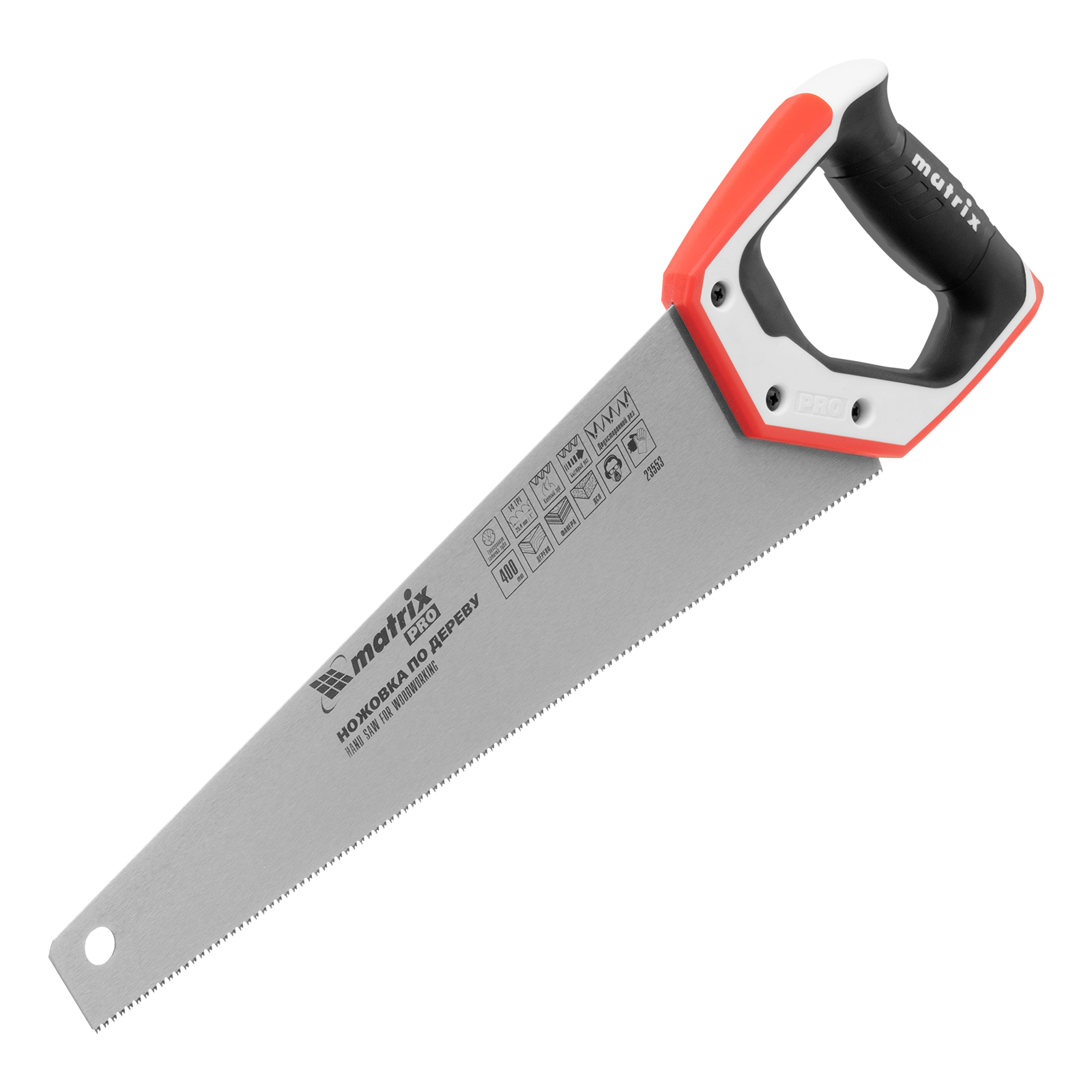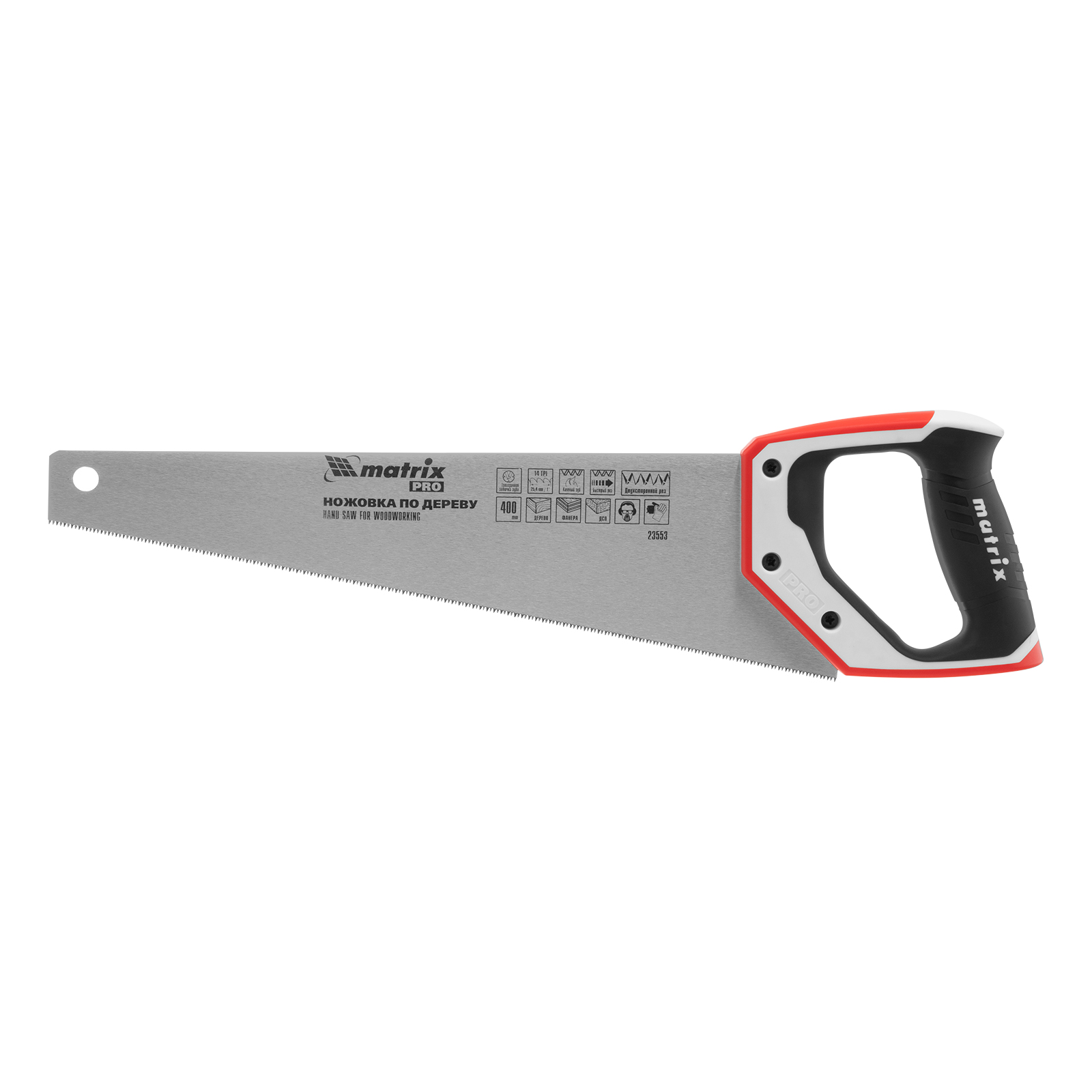 Ножовка по дереву Matrix PRO 23553 с полотном длиной 400 мм, калеными зубьями с шагом 14 TPI и 3D-заточкой, с трехкомпонентной рукояткой, предназначена для точных пильных работ с заготовками из древесины, фанеры и ДСП. Подходит для продольного и поперечного пиления. Шаг зубьев составляет 14 TPI, что обеспечивает точность реза. 3D-заточка зубьев увеличивает производительность ножовки. Инструмент будет полезен в столярной мастерской, а также пригодится в быту.