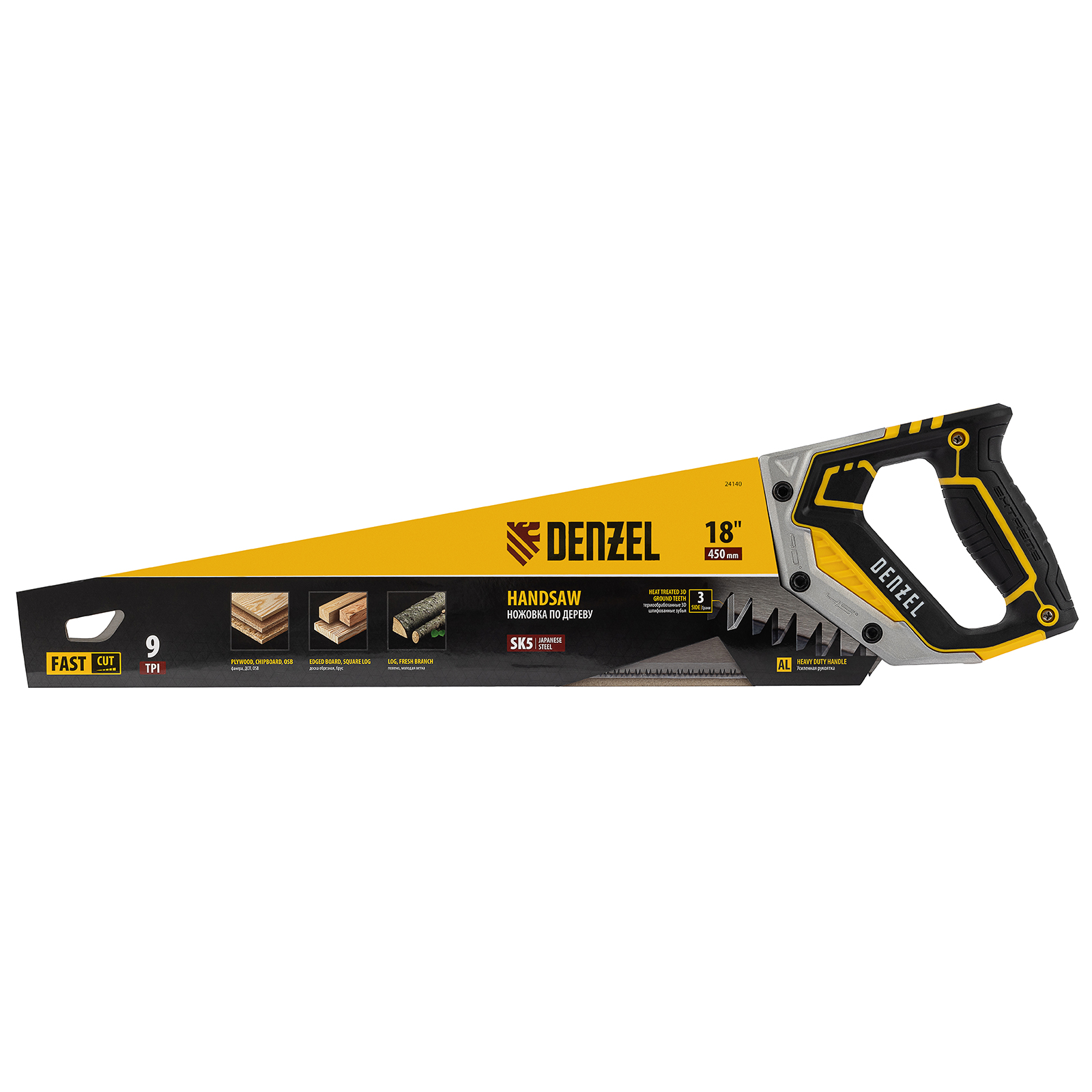 Ножовка по дереву Denzel 24140 длиной 450 мм, с зубьями с шагом 9 TPI и 3D-заточкой, с металлопластиковой рукояткой, предназначена для продольной и поперечной распиловки заготовок из древесины, ДСП, ДВП, МДФ, ламината, а также из ПВХ (труб, панелей, коробов). Подходит для спиливания молодых веток. Зубья с шагом 9 TPI позволяют выполнять быстрый рез. Ножовка используется для проведения столярных работ в мастерской и на дачном участке.