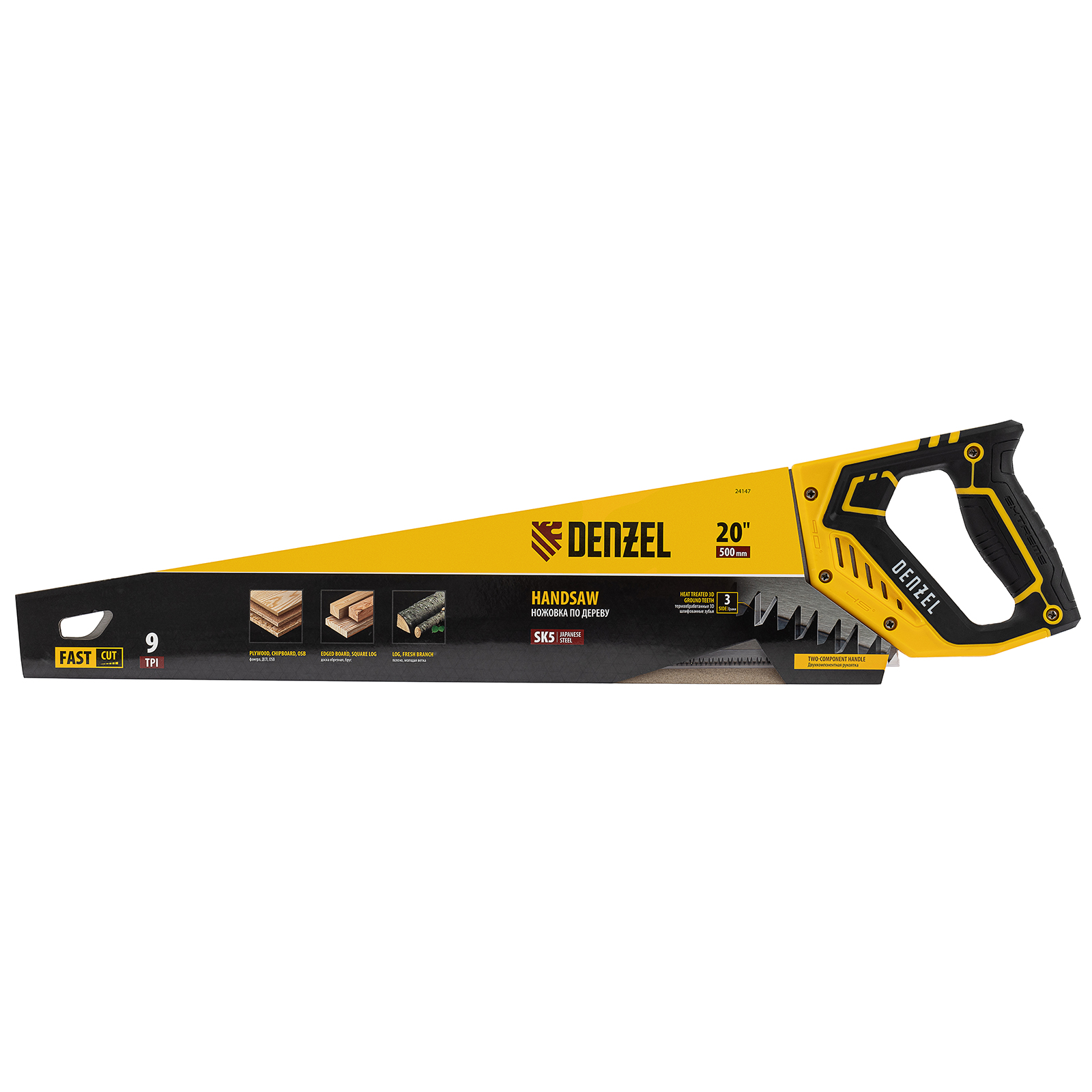 Ножовка по дереву Denzel 24147 длиной 500 мм, с зубьями с шагом 9 TPI и 3D-заточкой, с двухкомпонентной рукояткой, предназначена для продольной и поперечной распиловки заготовок из древесины, ДСП, ДВП, МДФ, ламината, а также из ПВХ (труб, панелей, коробов). Подходит для спиливания молодых веток. Зубья с шагом 9 TPI позволяют выполнять быстрый рез. Ножовка используется для проведения столярных работ в мастерской и на дачном участке.