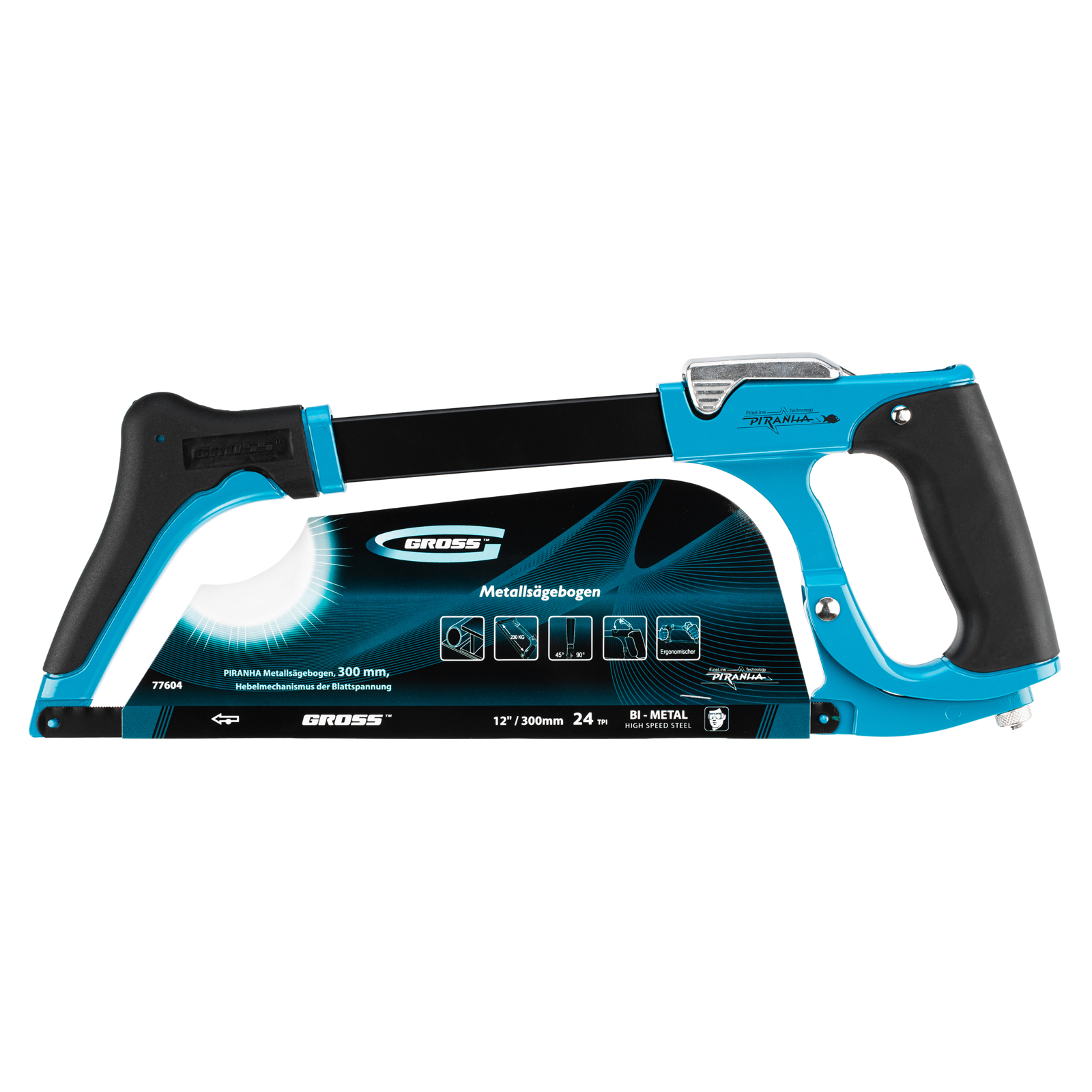 Ножовка по металлу Gross «PIRANHA» 77604, 300 мм, с рычажным механизмом натяжения полотна подходит для профессиональных строительных и слесарных операций. Подходит для поперечного и продольного реза заготовок за счет возможности установки полотна под углом 45° и 90°.