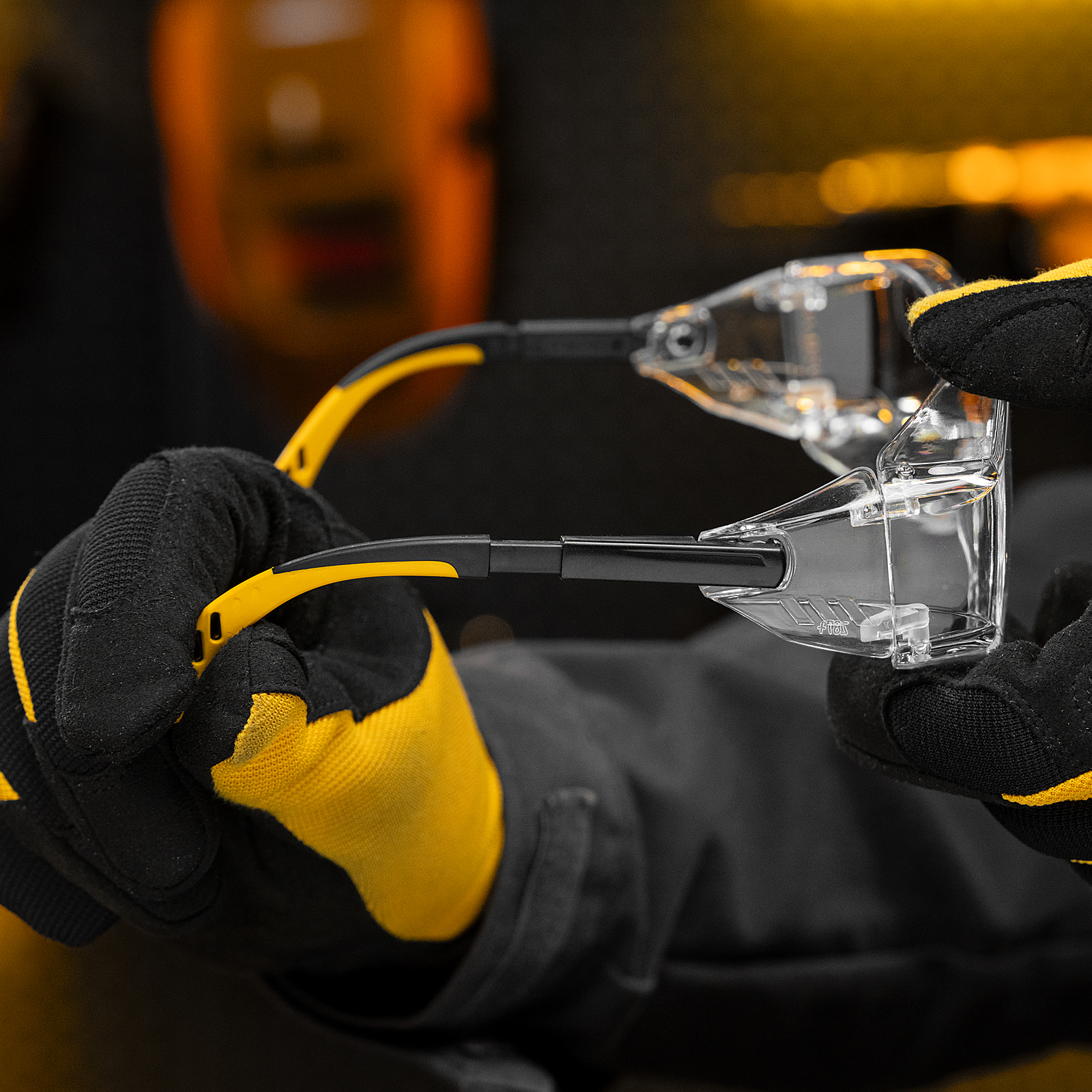 - Продуманная конструкция — особая форма линз обеспечивает боковую и надбровную защиту, а также позволяет носить защитные очки вместе с коррригирующими.