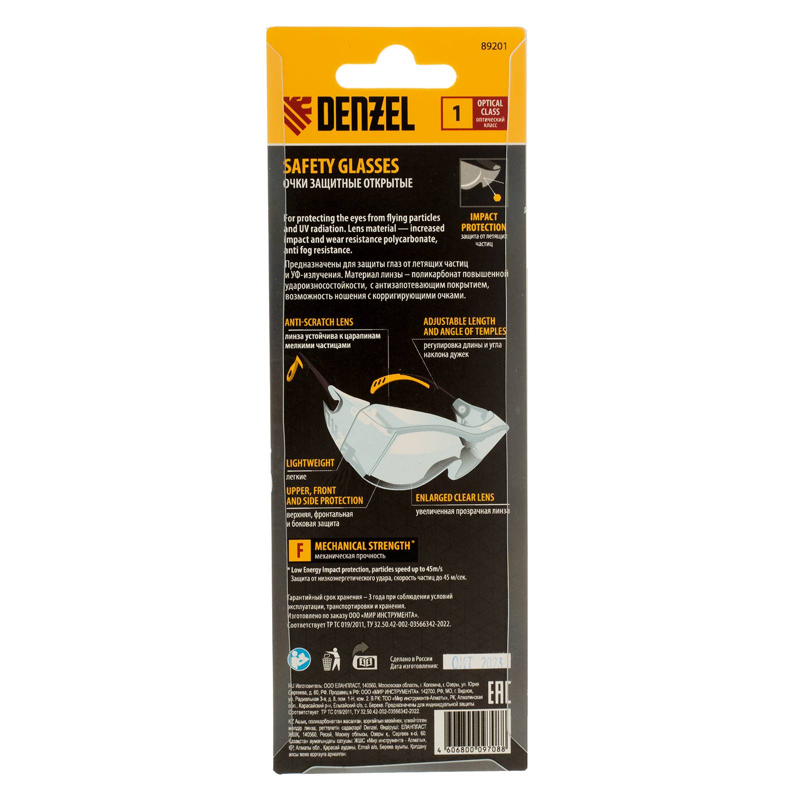 Очки защитные открытые, поликарбонатные, увеличенная прозрачная линза, регулируемые дужки Denzel