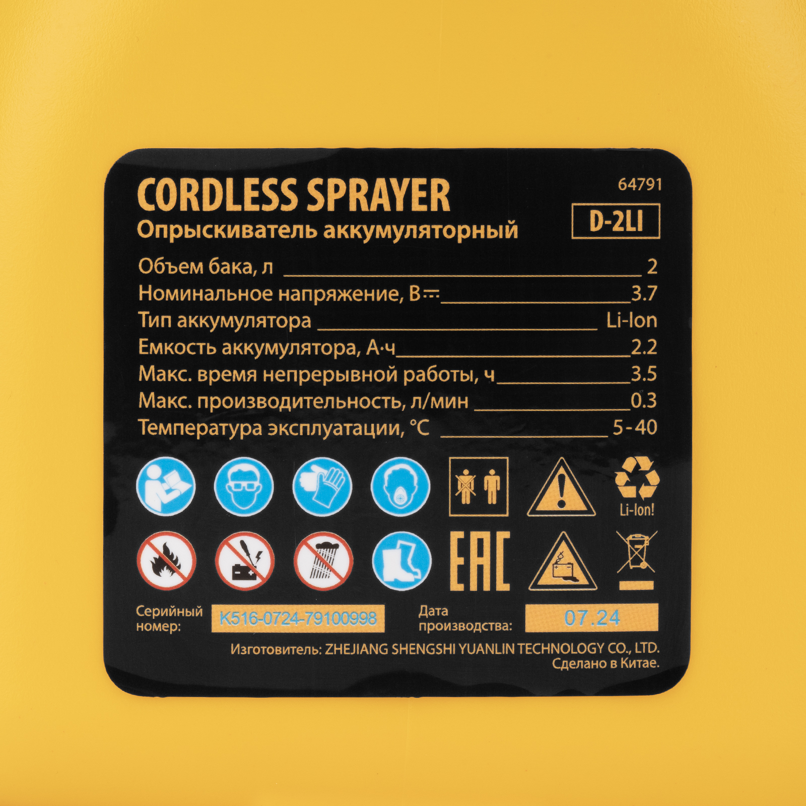 Аккумуляторный опрыскиватель Denzel D-2LI 64791 с баком объемом 2 л и Li-Ion батареей на 3,7 В, емкостью 2,2 А·ч, предназначен для ухода за растениями — внесения жидких удобрений, распыления инсектицидных средств. Также может использоваться для мытья окон, фасадов, дорожек, садового инвентаря. Размер и форма факела регулируются, максимальная дальность распыления составляет 1 м, что позволяет обрабатывать участки различной площади и удаленные места. Опрыскиватель экономит силы и время пользователя, будет полезен в быту и на производстве.