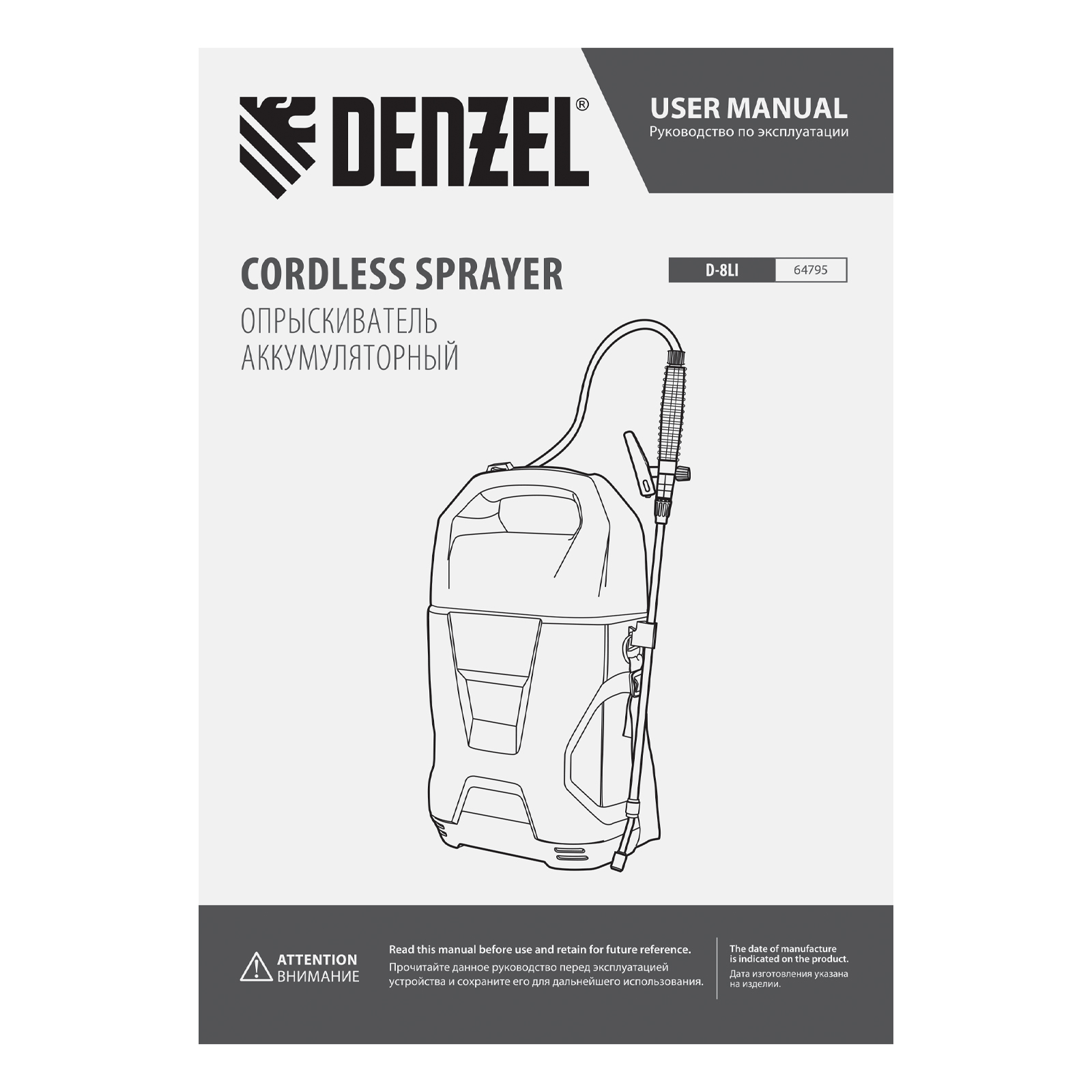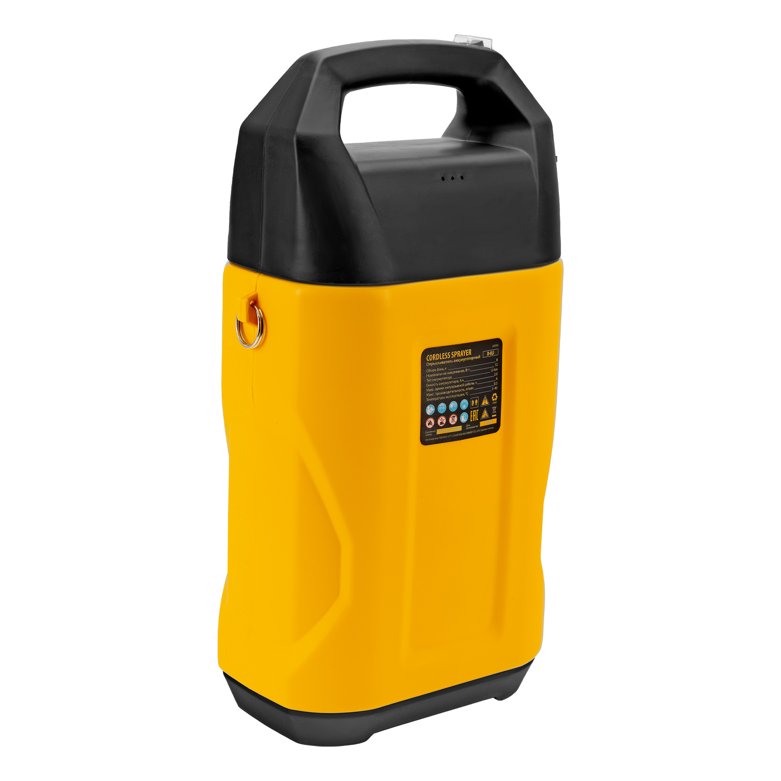 Аккумуляторный опрыскиватель Denzel D-8LI 64795 с баком объемом 8 л и Li-Ion батареей на 12 В, емкостью 2 А·ч, используется для ухода за растениями, а также для распыления инсектицидных жидкостей, дезинфекции помещений, мытья окон, стен и дорожек. Длина штанги регулируется в диапазоне 380-630 мм, а максимальная дальность распыления составляет 4 м, что позволяет обрабатывать участки большой площади и труднодоступные места. Опрыскиватель экономит силы и время пользователя, будет полезен в быту и на производстве.