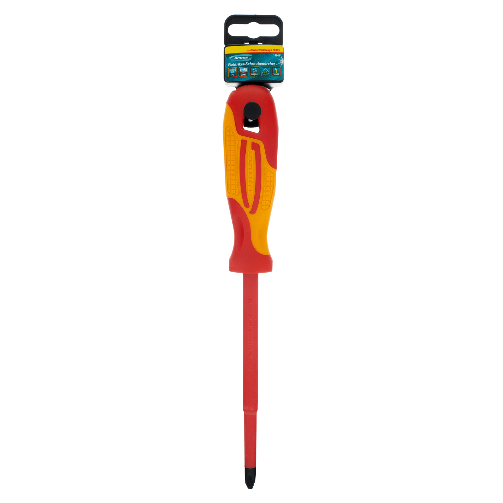 Диэлектрическая отвертка Gross 12949 до 1000 В, PH3 х 150 мм, из стали CrMo, с двухкомпонентной рукояткой, применяется при проведении работ с крепежом типа Phillips. С ее помощью можно установить электросчетчики, клеммники, розетки и т.д. Отвертка со стержнем длиной 150 мм оптимально подходит для работы на поверхностях и в углублениях. Внимание — техника безопасности запрещает выполнять работы под напряжением!