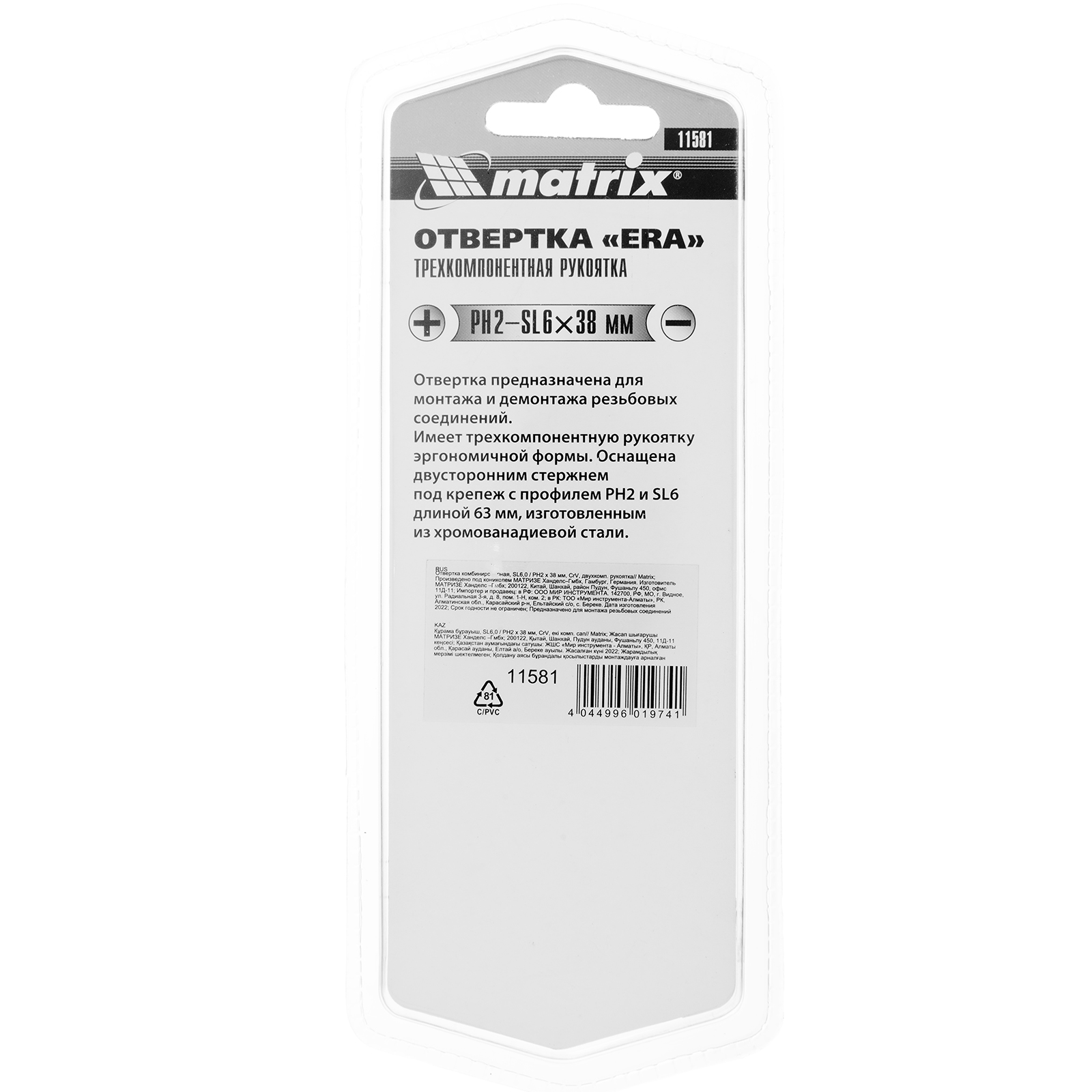 Комбинированная отвертка Matrix 11581 из стали CrV, с двухкомпонентной рукояткой и стержнем длиной 38 мм, позволяет монтировать и демонтировать крепеж типоразмера SL6,0 и PH2. Она рассчитана на профессиональное использование, в частности, осуществление строительных и монтажных работ. Благодаря длине стержня 38 мм и укороченной рукоятке можно производить работы в ограниченном пространстве.
