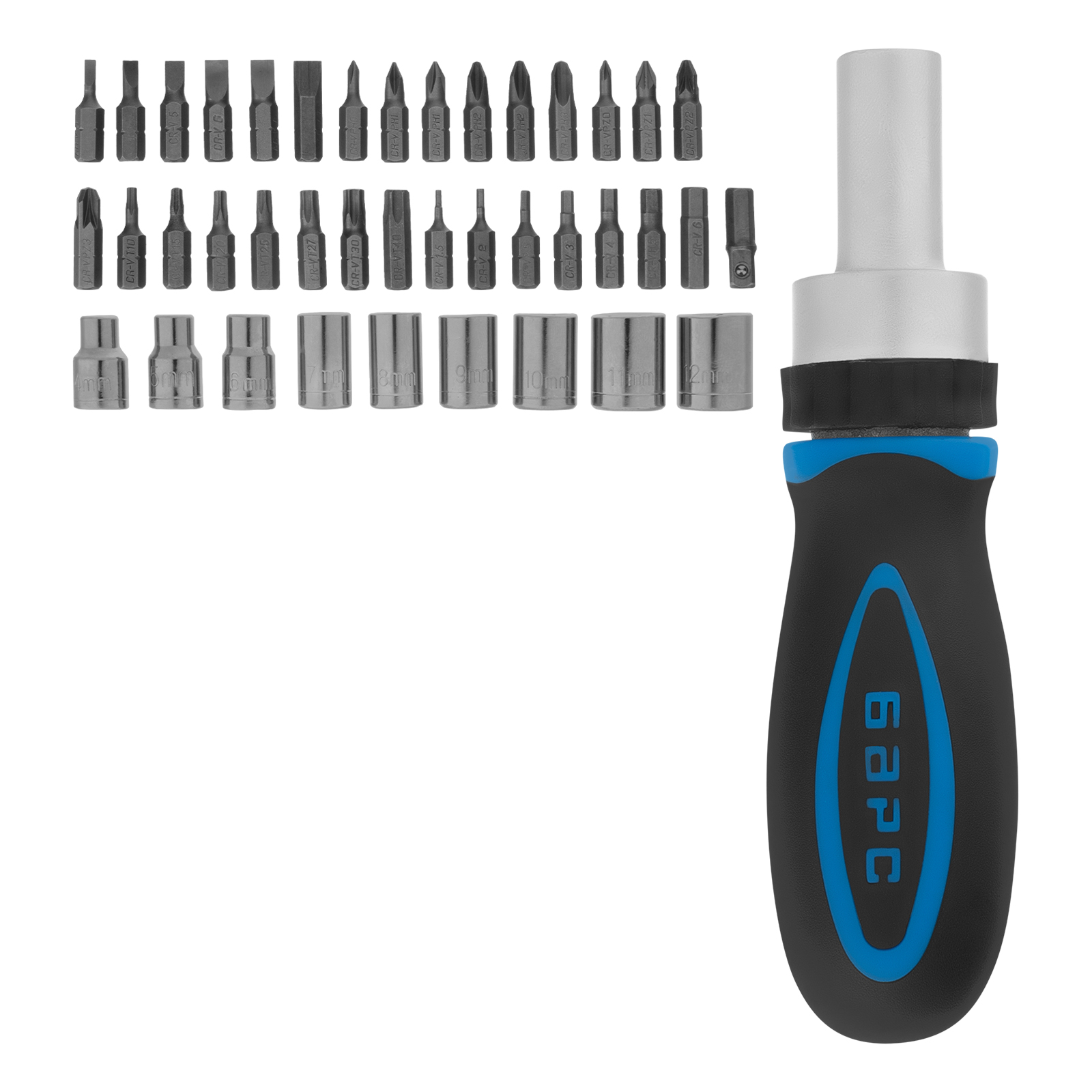 Отвертка реверсивная - 1 штБиты 25 мм: РН0, РН1, РН2, РН3, PZ0, PZ1, PZ2, PZ3, SL3, SL4, SL5, SL6, SL7, H1.5, H2, H2.5, H3, H4, H5, H6, T10, T15, T20, T25, T27, T30, T40 - 27 штТорцевые головки: 4 мм, 5 мм, 6 мм, 7 мм, 8 мм, 9 мм, 10 мм, 11 мм, 12 мм - 9 штАдаптер для бит 1/4" - 1 шт |