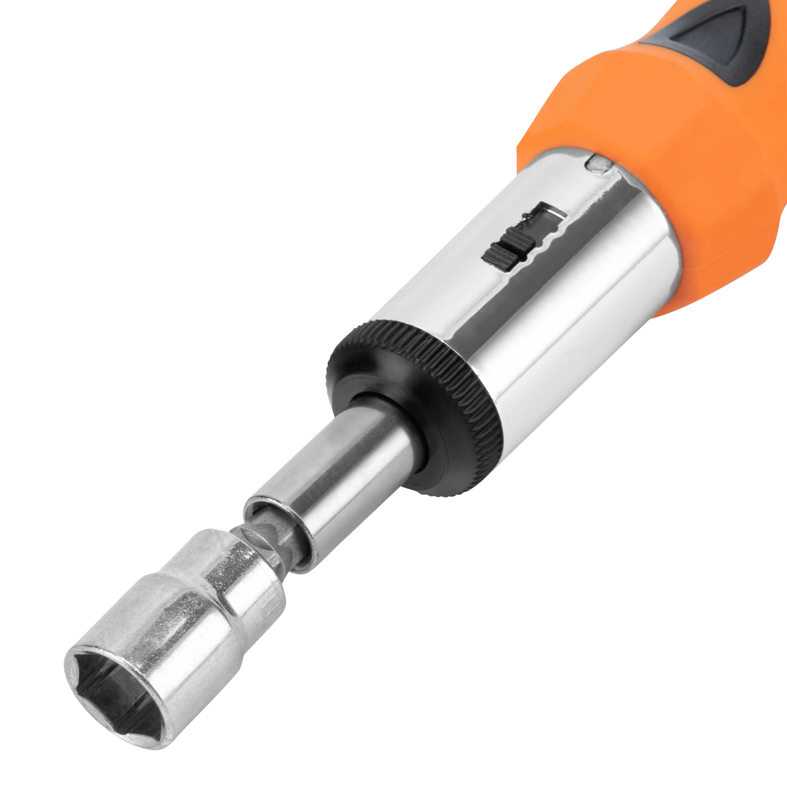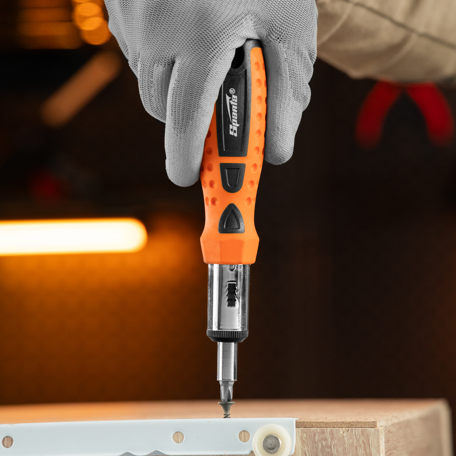 Реверсивная отвертка с шарниром Sparta 115565 входит в набор из 14 предметов, включающий также биты с хвостовиком 1/4 дюйма (тип С), торцевые головки и переходник для торцевых головок. Инструмент с насадками применяется для быстрого и эффективного монтажа/демонтажа резьбовых соединений. Реверсивный механизм значительно облегчает работу и снижает усталость рук, т.к. не требуется постоянно перехватывать ручку отвертки. С отверткой можно использовать любые биты длиной 25 мм. Комплект пригодится частным мастерам при проведении ремонтных работ.