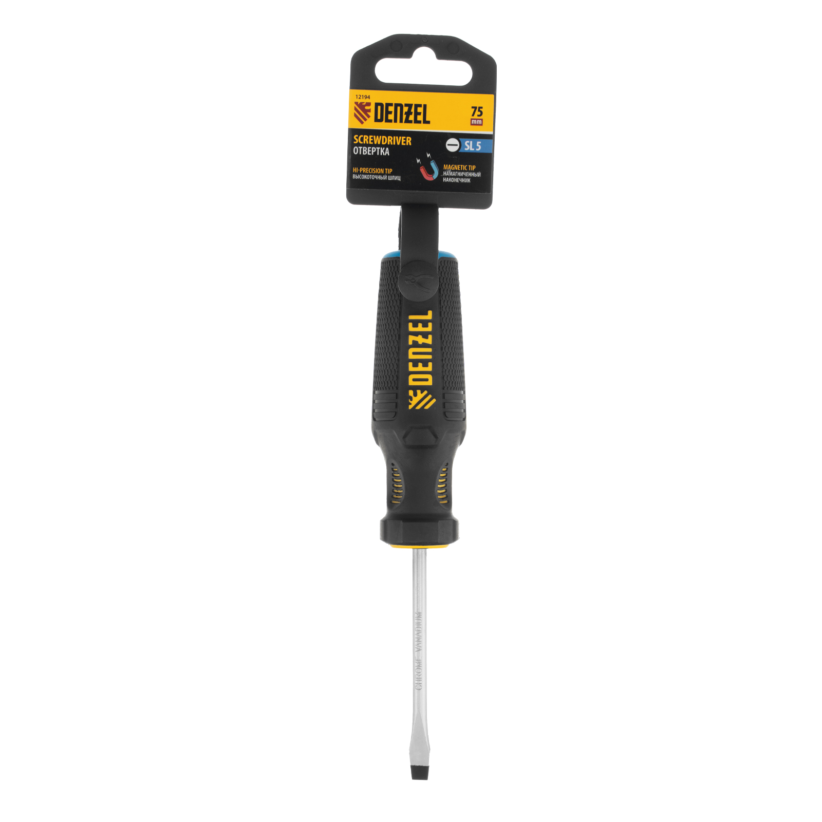 Отвертка SL5 х 75 мм Denzel 12194 из стали CrV, с трехкомпонентной рукояткой, используется для монтажа и демонтажа винтов и саморезов с прямым шлицем Slotted. Намагниченный шлиц крепко фиксируется в головке крепежа. Отвертка выдерживает интенсивное применение и предназначена для выполнения профессиональных ремонтных и монтажных работ.