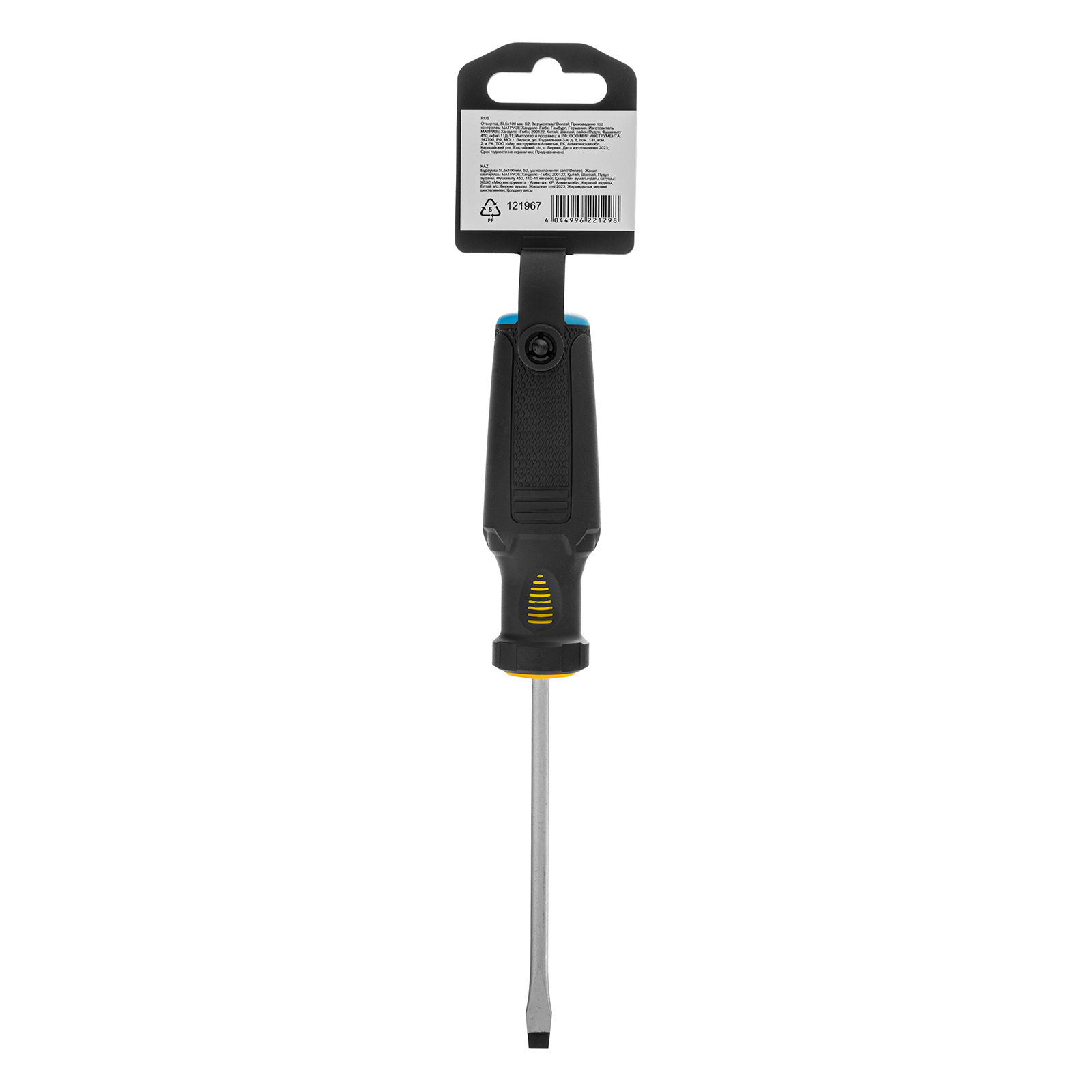 Отвертка Denzel 121967 с трехкомпонентной рукояткой, со стержнем из стали S2, длиной 100 мм, предназначена для монтажа и демонтажа винтов и саморезов с прямым шлицем SL5. Высокоточный намагниченный шлиц крепко фиксируется в головке крепежа. Отвертка выдерживает интенсивное применение, предназначена для выполнения профессиональных ремонтных и монтажных работ.
