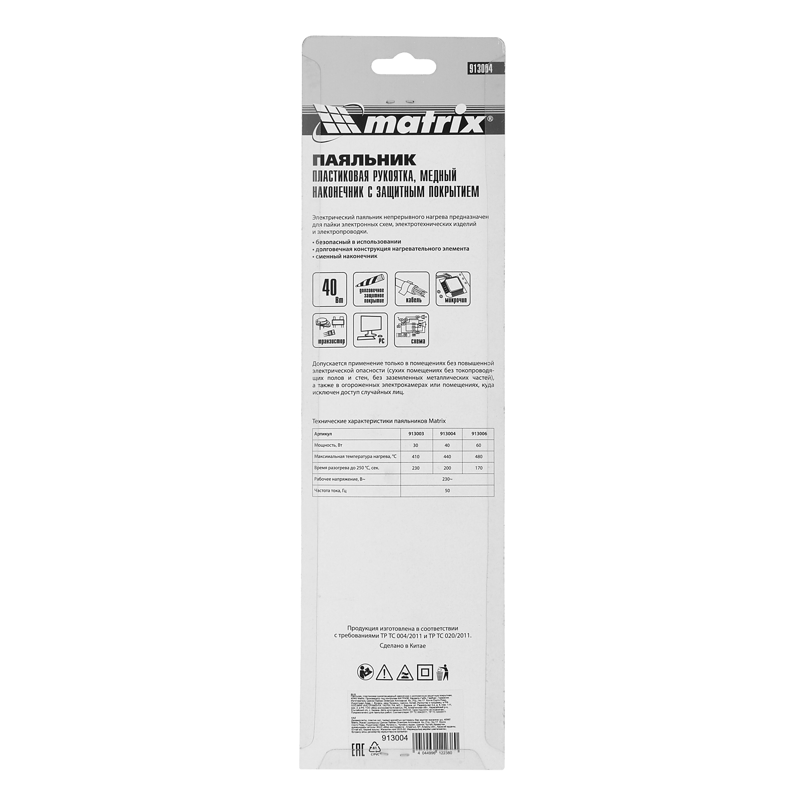 Паяльник Matrix 913004 мощностью 40 W, с пластиковой рукояткой, работающий от сети 220 В, имеет медный наконечник с долговечным гальваническим защитным покрытием, надежно защищающим его от внешних воздействий. Конусовидное жало удобно для выполнения точных работ. Благодаря нагревательному элементу в виде нихромовой спирали паяльник устойчив к повреждениям. Инструмент используется для пайки проводов, микрочипов, электрических схем и транзисторов. Будет полезен для ремонта автомобилей, электроники и бытовой техники.