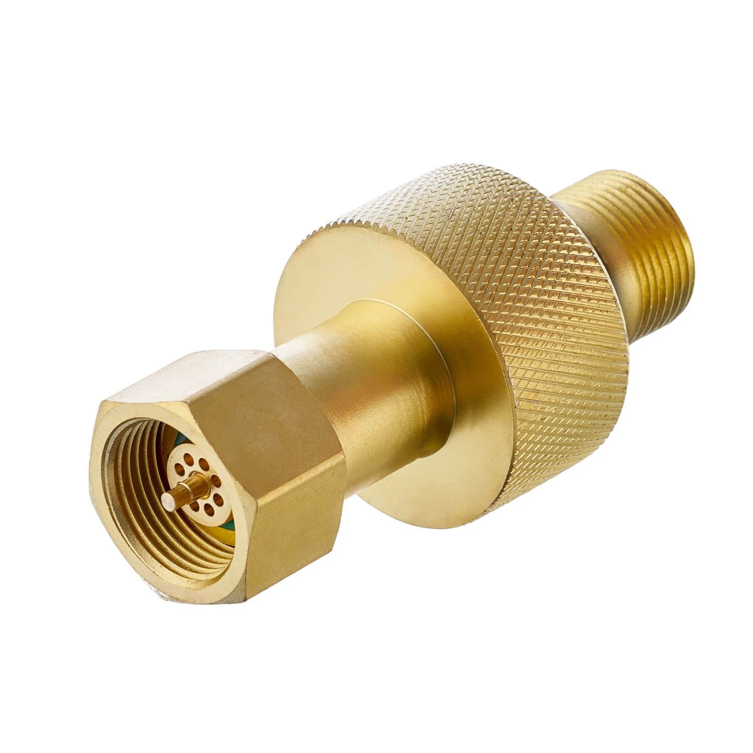 Переходник для заправки баллонов является универсальным переходником, который закреплен, с одной стороны, к подающему газ коллектору, где оператор наполнительной станции может быстро присоединить вращающуюся часть переходника к вентилю заполняемого баллона, после чего провести затяжку гайки. Переходник имеет наружную и внутреннюю резьбу G3/4-В.