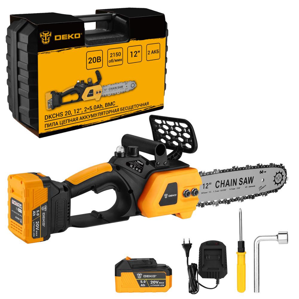 Пила цепная аккумуляторная бесщеточная в кейсе DEKO DKCHS 20, 12", 20В, 2x5.0Ач, з/у