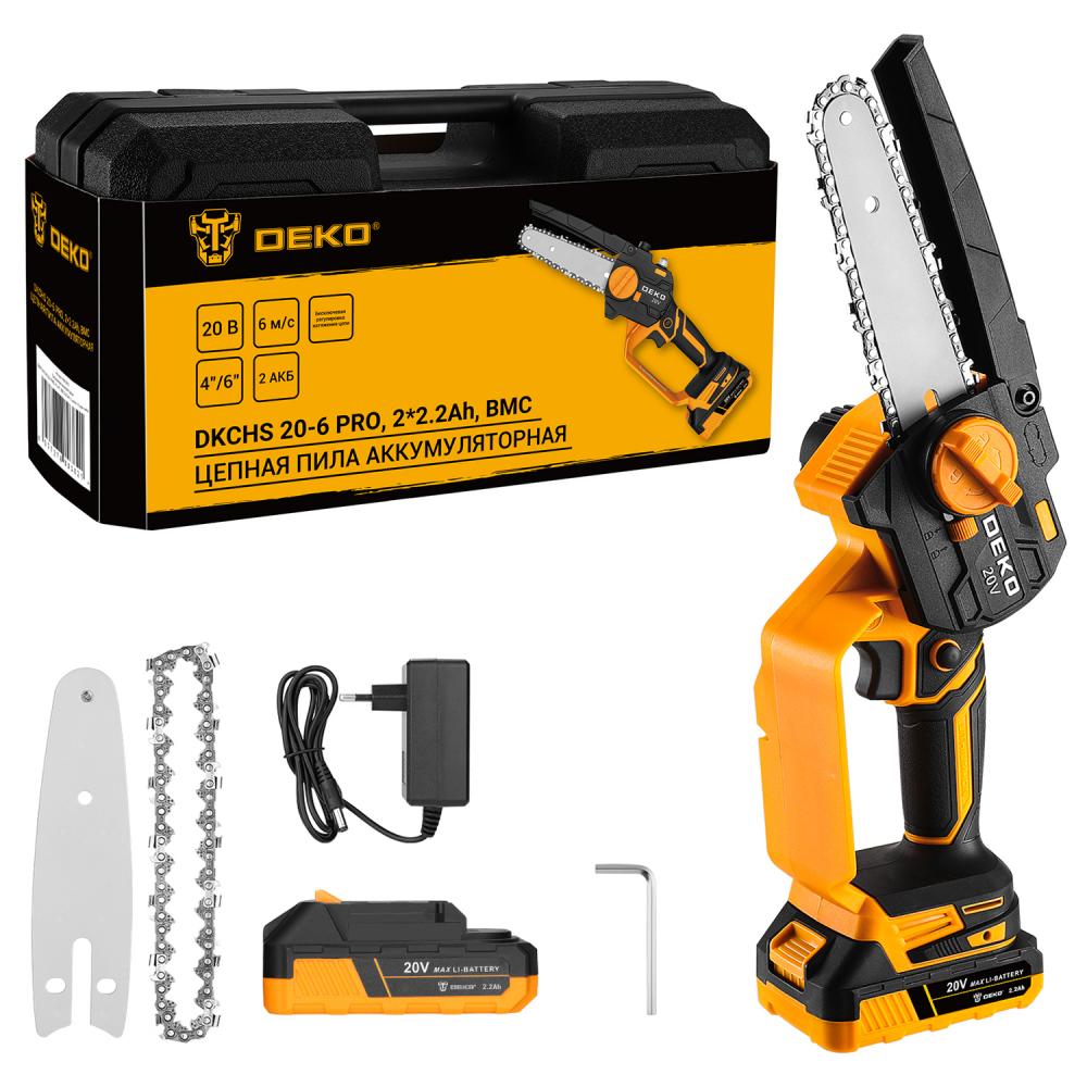 Пила цепная аккумуляторная DEKO DKCHS 20-6 PRO, 4" и 6", 20В, 2x2.2Ач, 2 шины и 2 цепи в кейсе