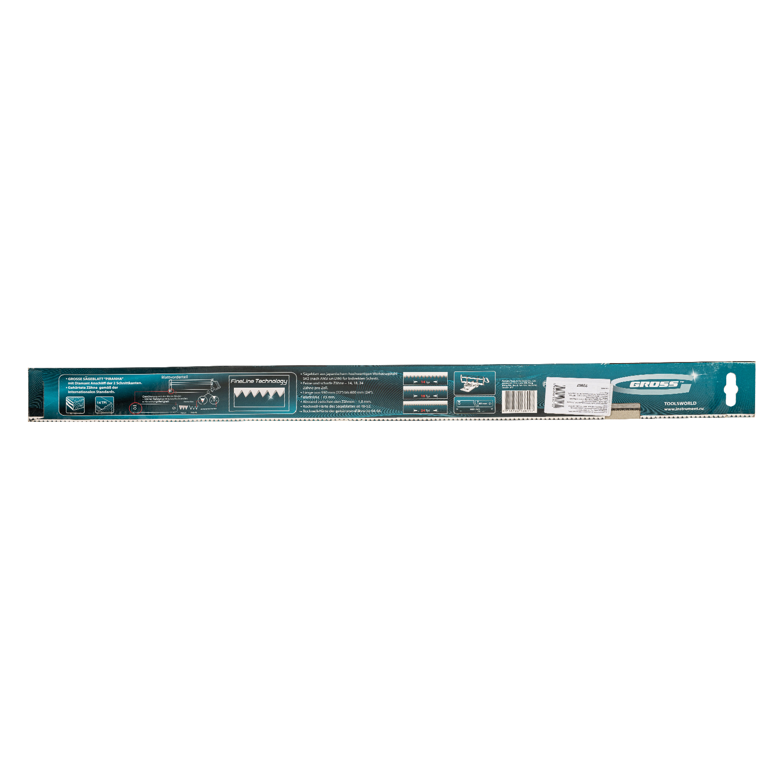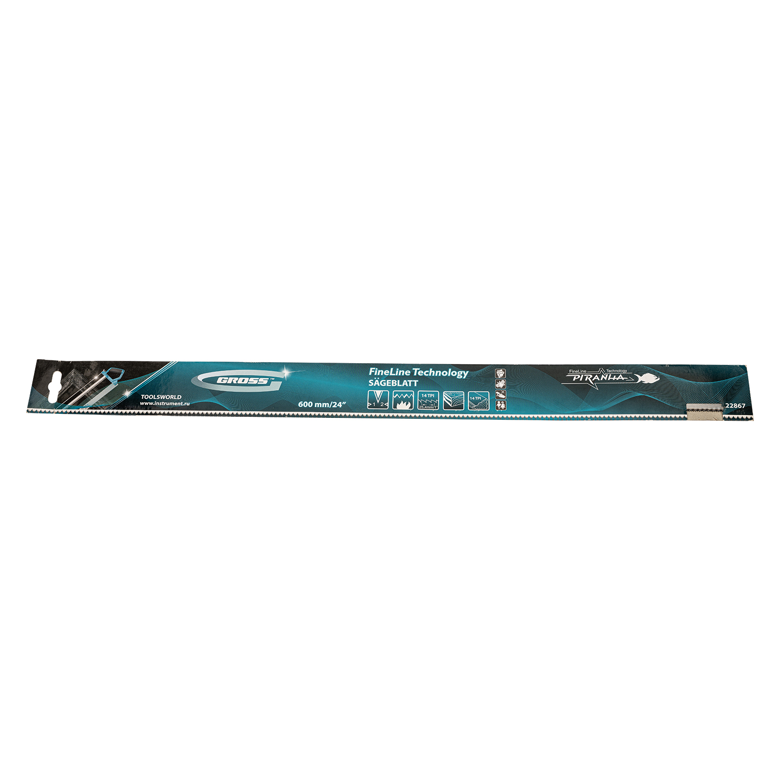 Пильное полотно Gross «PIRANHA» 22867 длиной 600 мм, с каленым зубом с 2D-заточкой, 14 TPI — режущий элемент для прецизионного стусла, применяемый для распила под углом заготовок из дерева, мягкого металла и пластика. Мелкие зубья с шагом 14 TPI позволяют получить точный и чистый рез. Полотно используется для пиления плинтусов, реек, дверных наличников и других деталей.