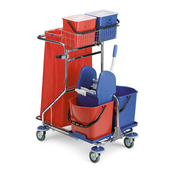 Универсальная тележка SMART 7230 имеет раму из хромированной стали на четырёх поворотных колёсах диаметром 100 мм, обеспечивающих необходимую устойчивость  и маневренность при передвижении. В комплект входят два ведра по 15 л, два маленьких ведерка на 6 л, универсальный отжим для МОПов, подвесная хромированная корзина, держатель для швабры, держатель для мусорного мешка. Тележка имеет компактный размер, не занимает много место при хранении, удобна и практична при эксплуатации.