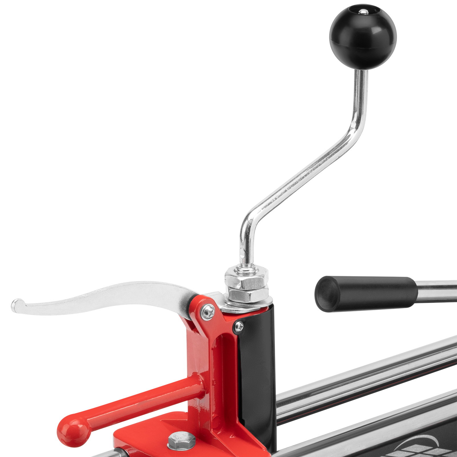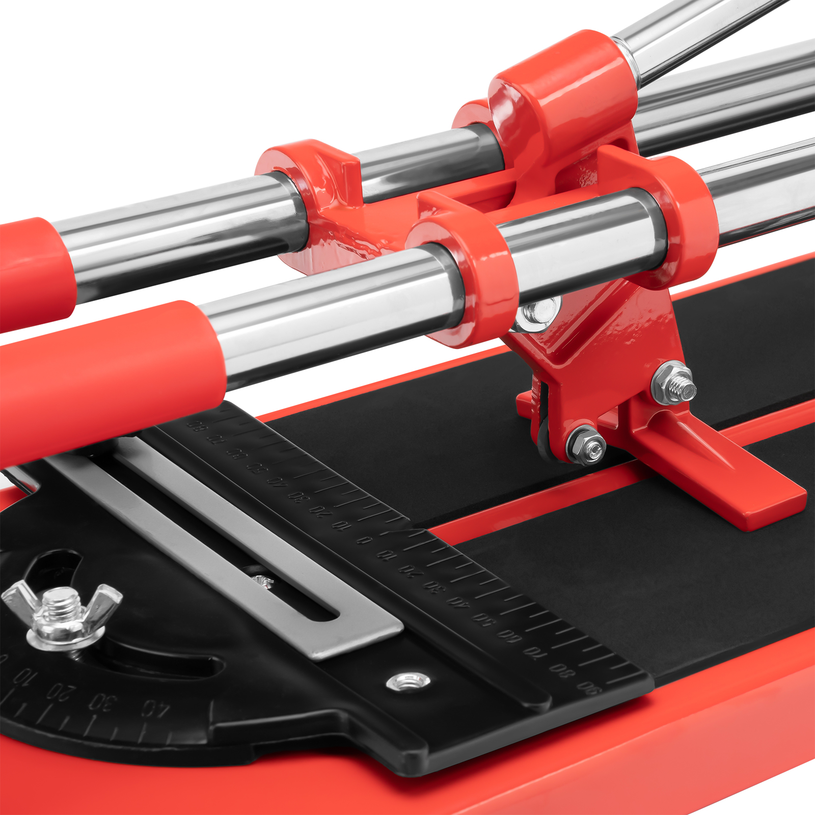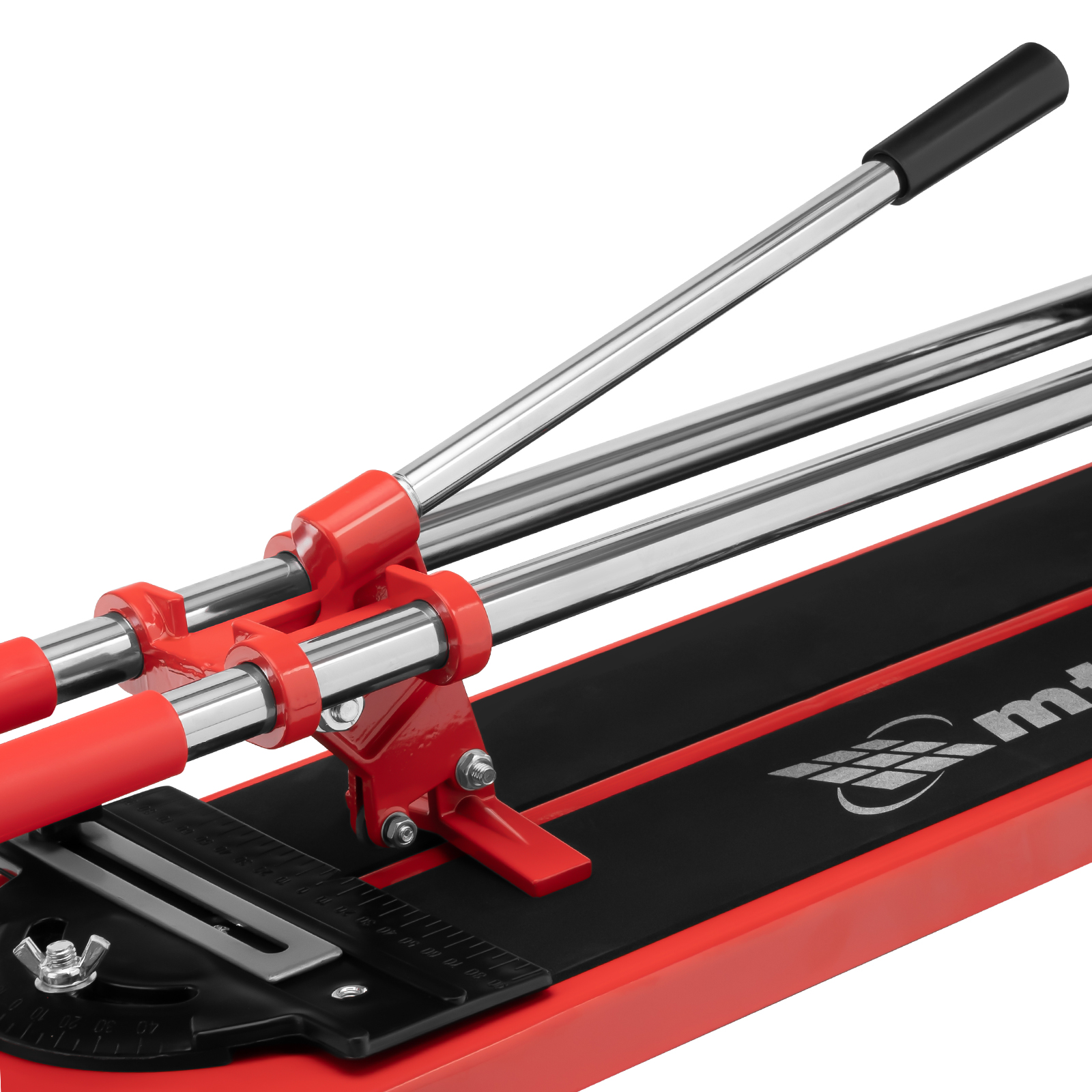 - Неподвижность плитки — плиткорез с широким основанием снабжен мягкими амортизирующими накладками, угольник-угломер дополнительно фиксирует заготовку.
