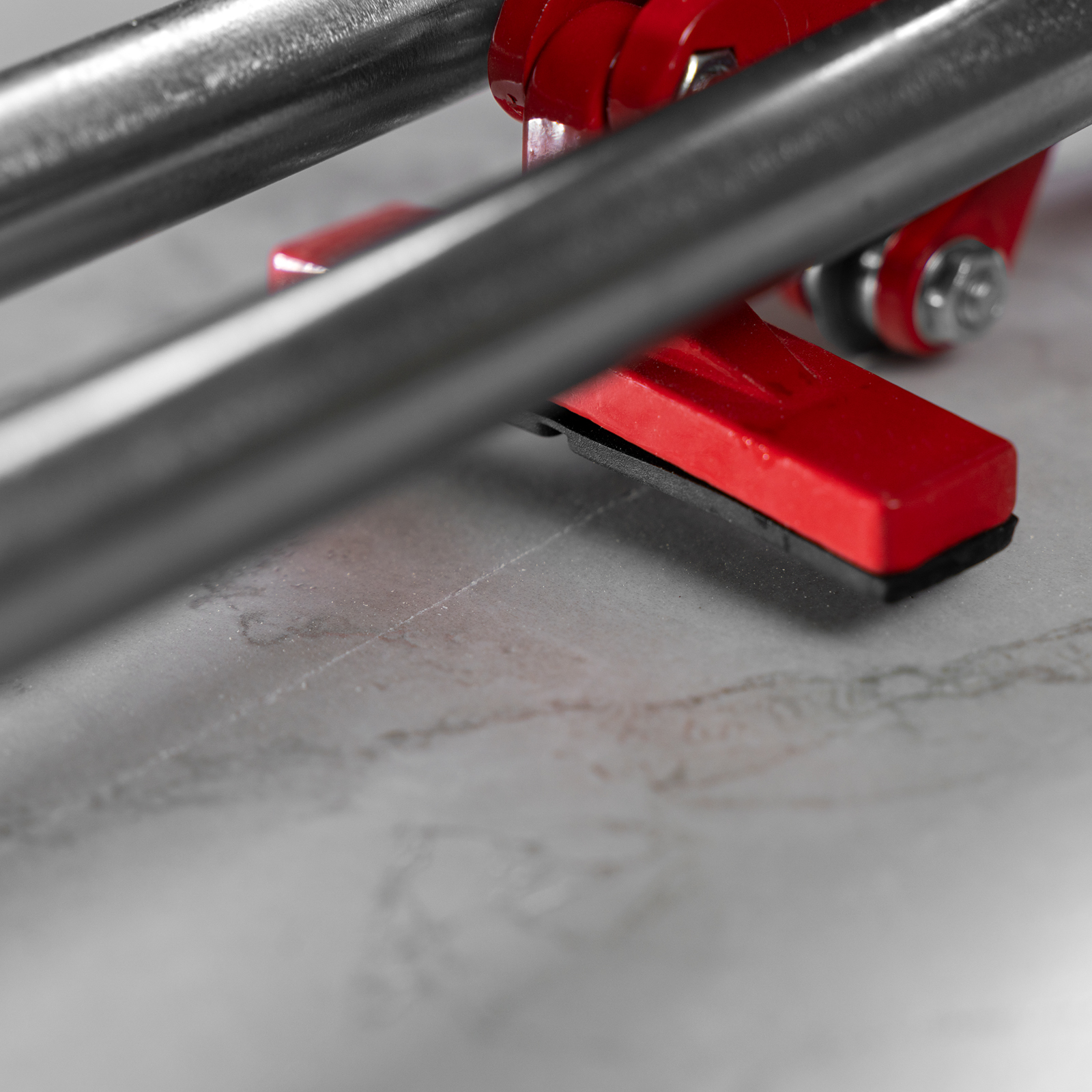 • Устойчивое основание и неподвижность плитки — плиткорез снабжен цельнолитой станиной из алюминиево-магниевого сплава с обрезиненной поверхностью, а также мягкими амортизирующими накладками.