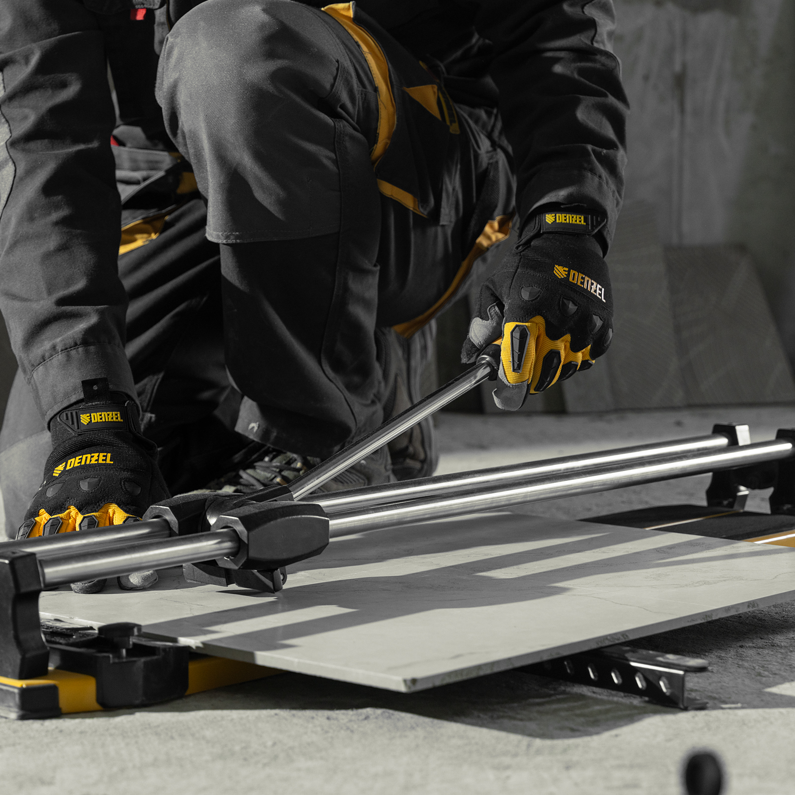 - Удобная работа — благодаря противоскользящим накладкам плиткорез не смещается даже на гладких поверхностях.