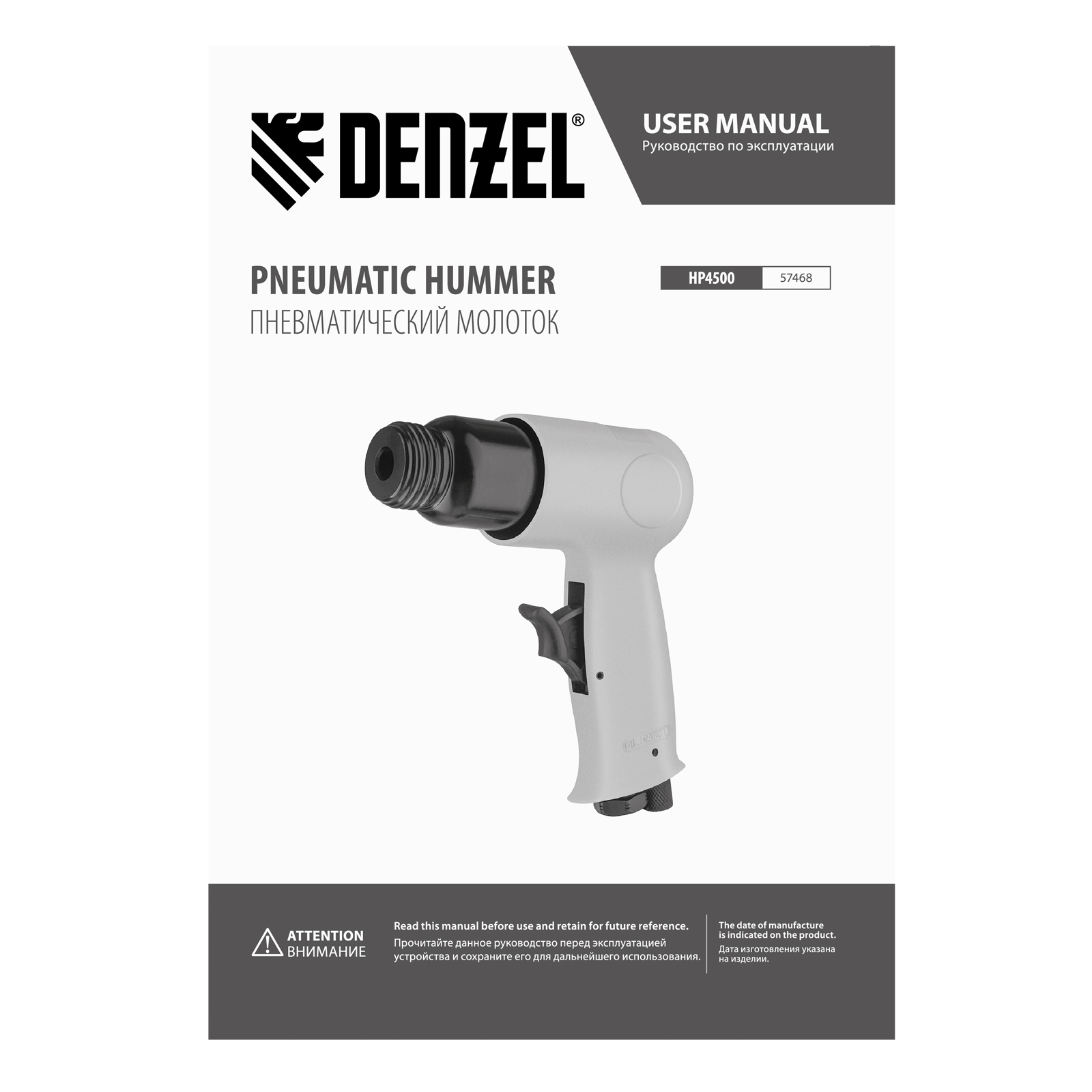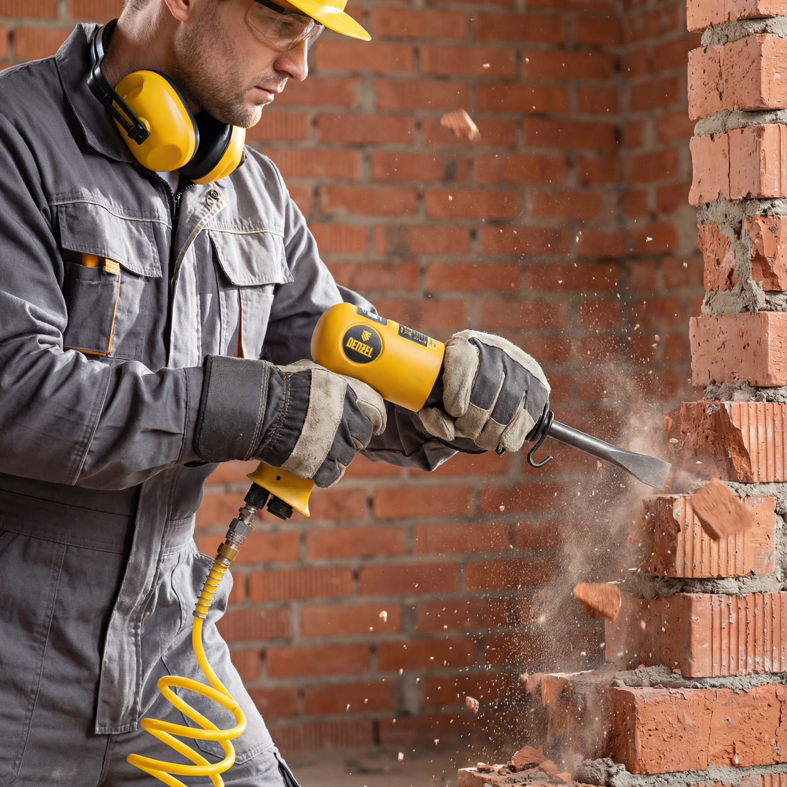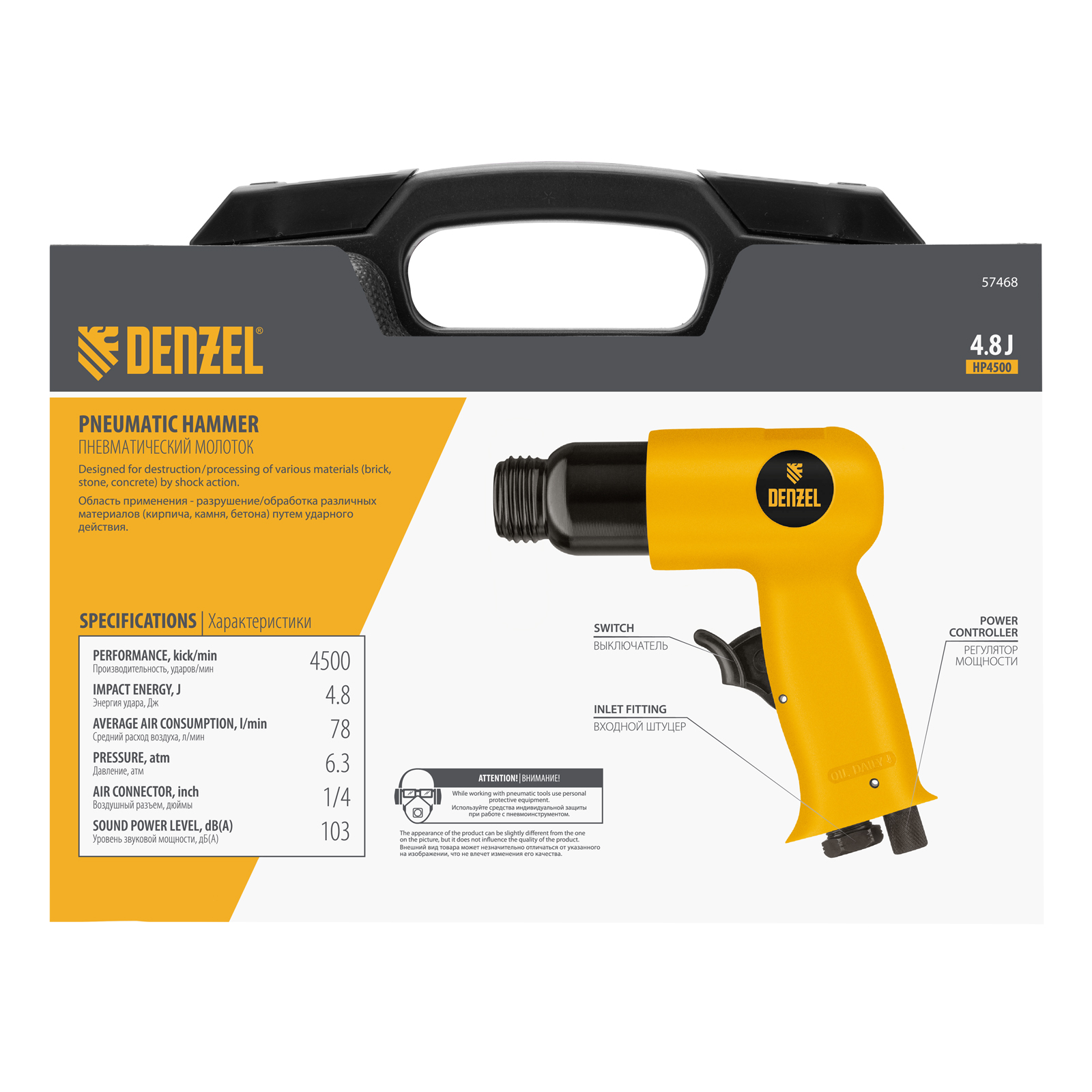 Пневматический молоток Denzel НР4500 57468 с набором насадок в комплекте, производительностью 4500 уд/мин, потребляет 113 л воздуха в минуту и используется для резки, дробления конструкций и материалов из древесины, кирпича, камня или бетона. Благодаря высокой скорости работы подходит для профессионального использования. Расход воздуха невелик, поэтому молоток можно использовать с небольшими компрессорами.