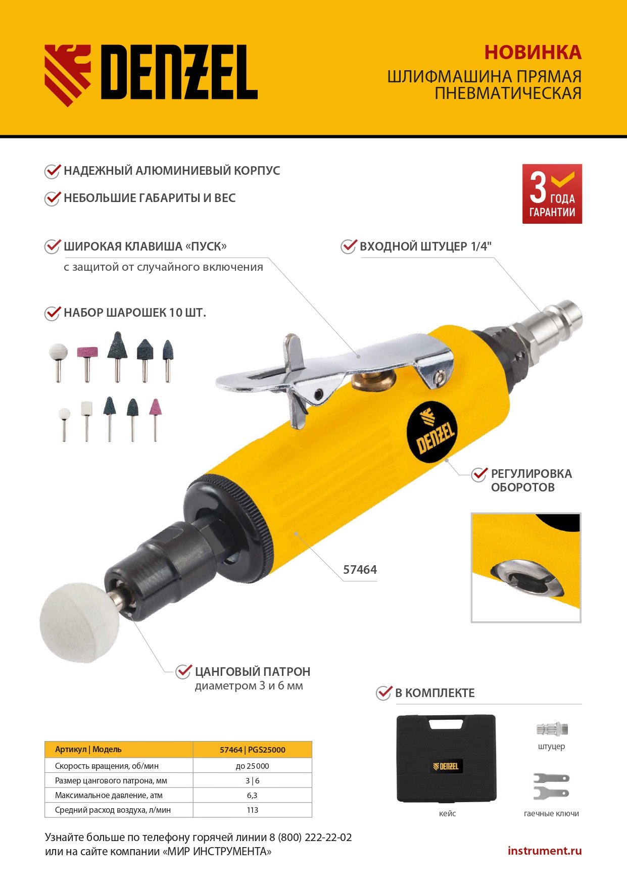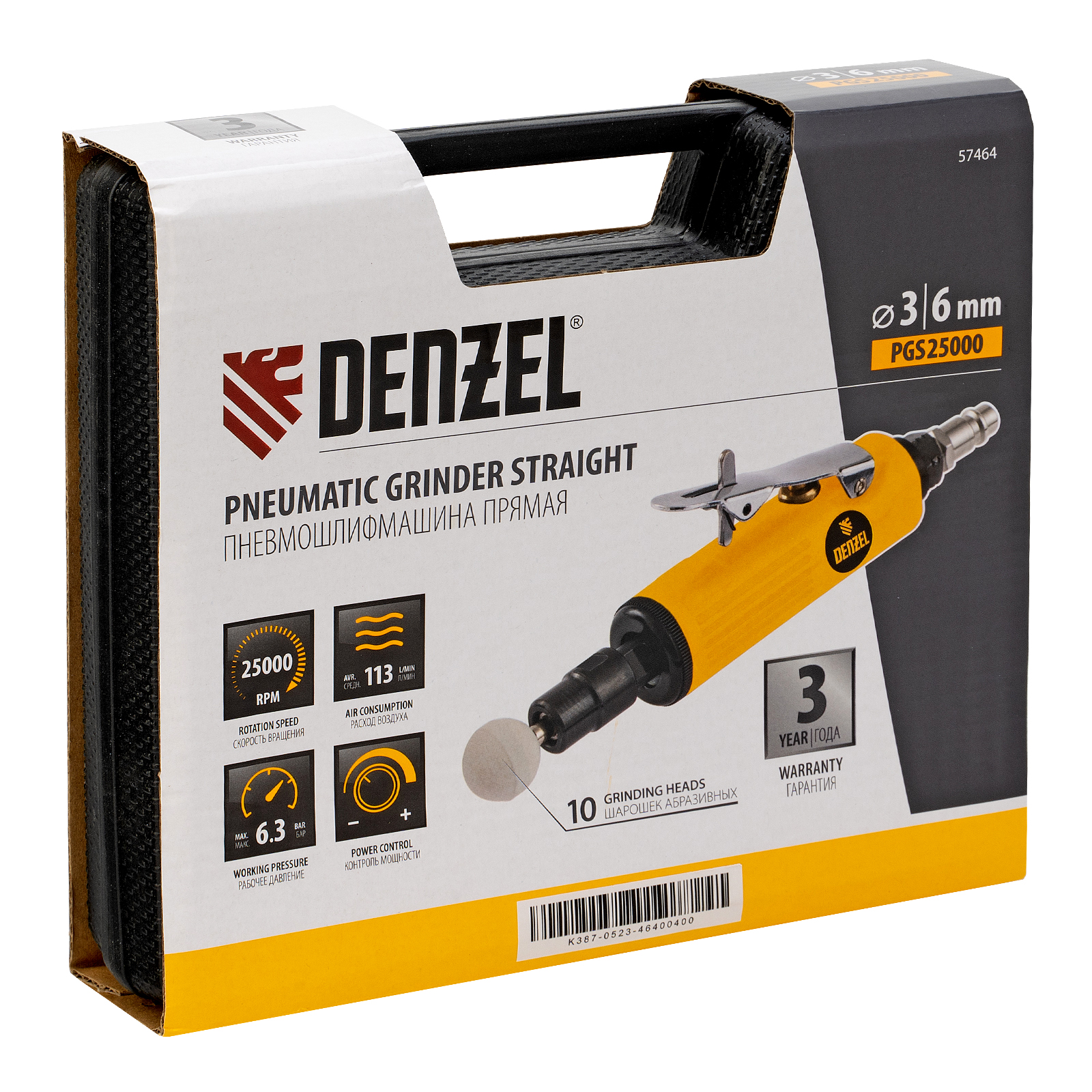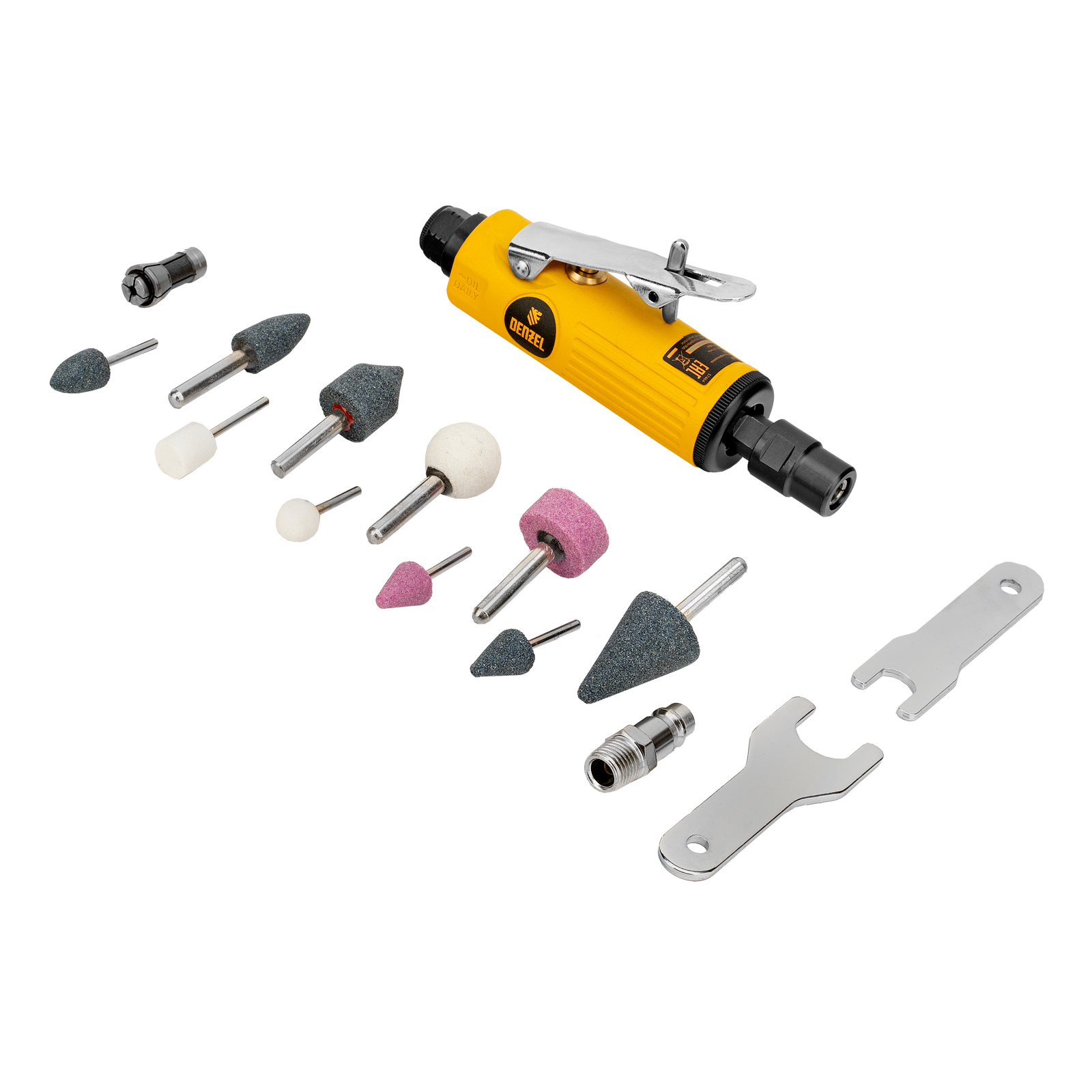 Пневмошлифмашина прямая PGS25000, 25000 об/мин, 10 шлиф. камней, цанга - 3, 6 мм, 113 л/мин Denzel в Санкт-Петербурге