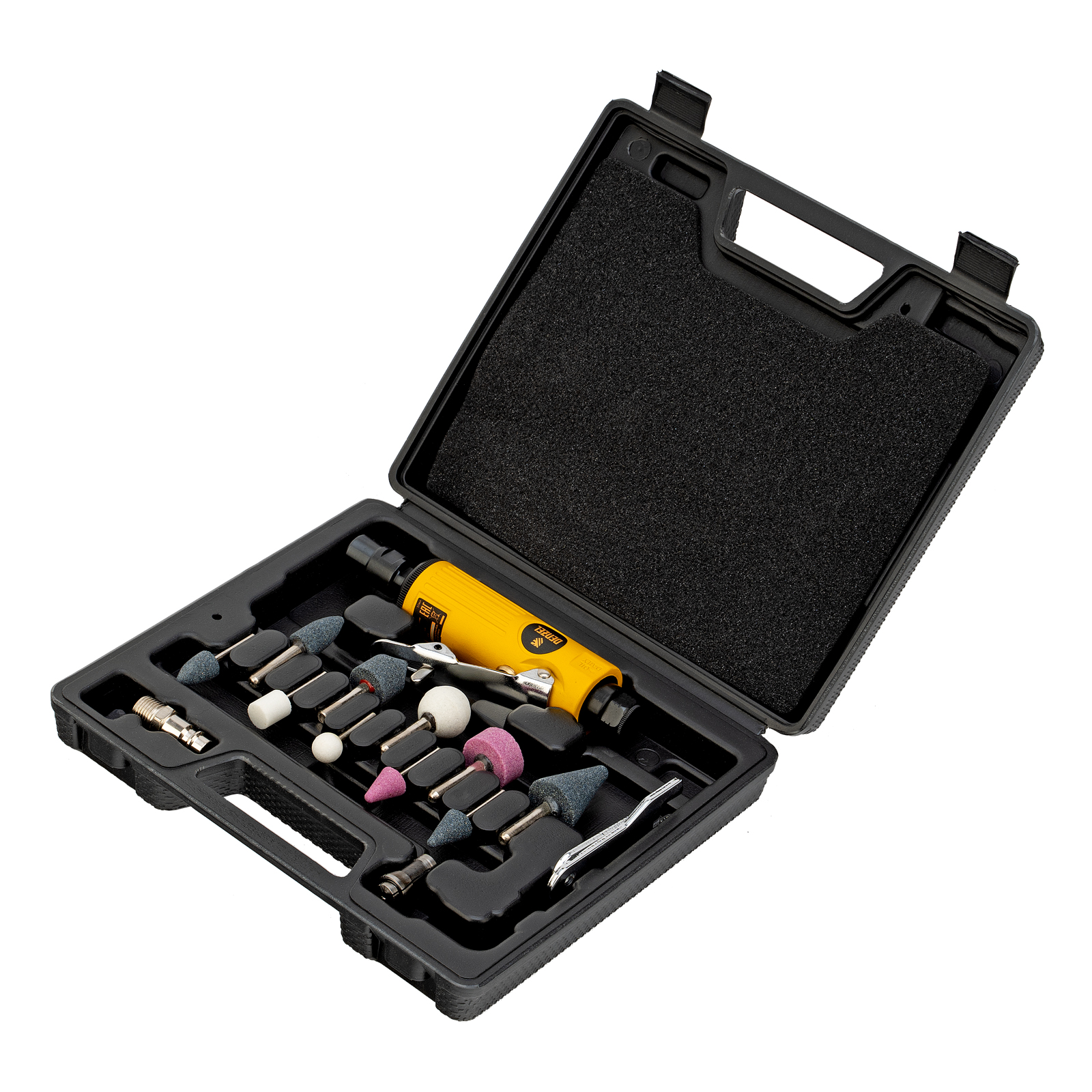Пневмошлифмашина прямая - 1 штШтуцер 1/4" - 1 штШлифовальные камни - 10 штЦанга - 2 штГаечный ключ - 2 штКейс - 1 штРуководство по эксплуатации и гарантийный талон - 1 шт |