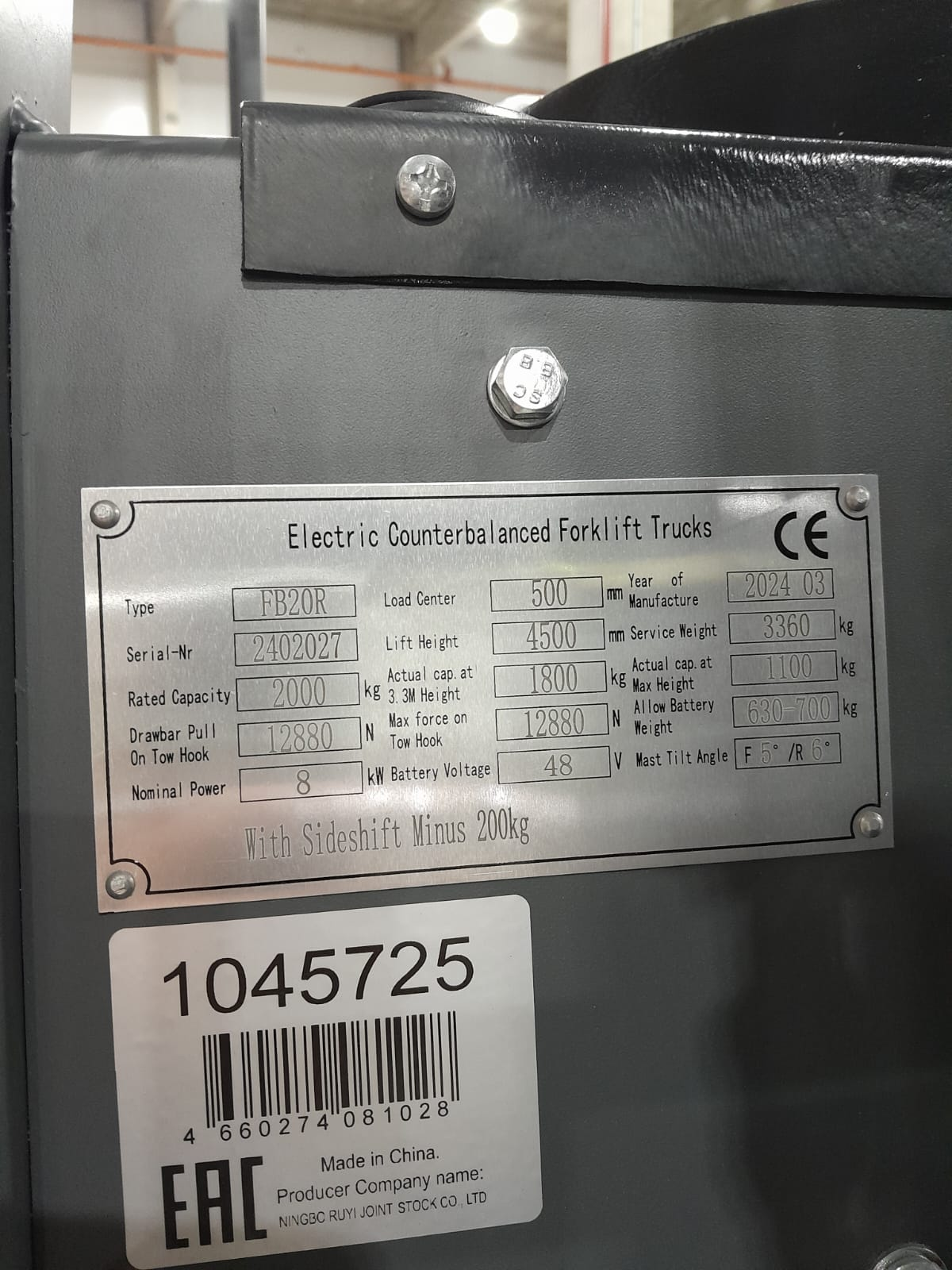 Погрузчик электрический четырехопорный TOR 2,0 т 4,5 м FB20R сайдшифт, своб. ход мачты в Санкт-Петербурге
