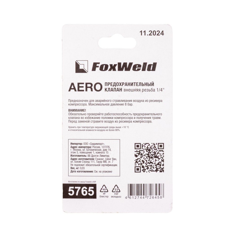 Предохранительный клапан с внешней резьбой 1/4 AERO в Санкт-Петербурге