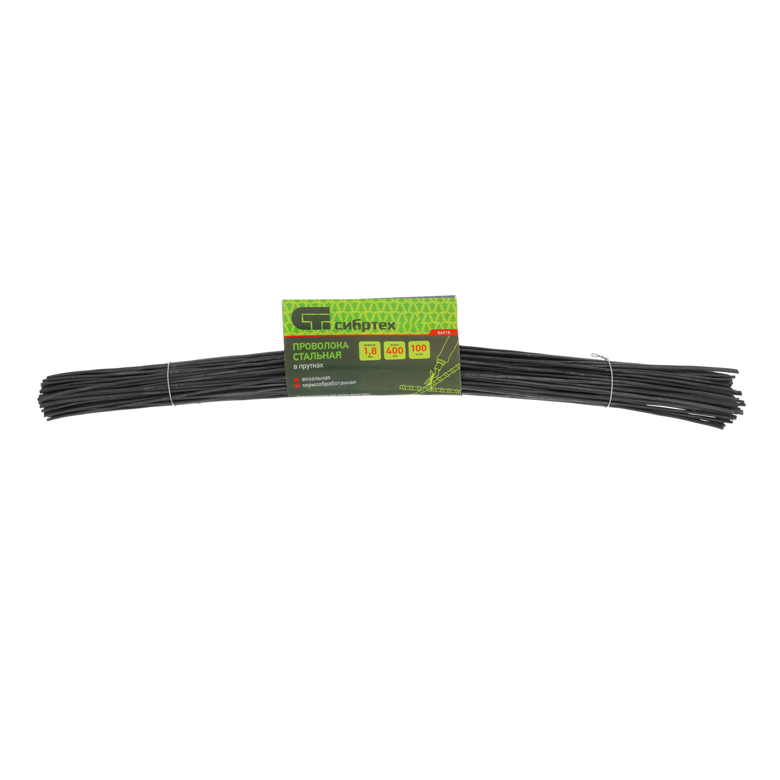 Вязальная стальная проволока в прутках Сибртех 84918, термообработанная, длиной 400 мм и диаметром 1,8 мм, 100 шт., предназначена для вязки стальных сеток и арматуры. Пригодится на строительных площадках для армирования конструкций из железобетона.
