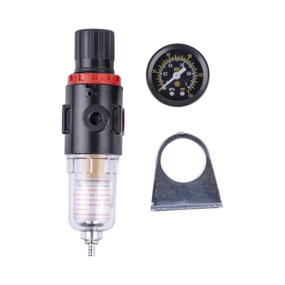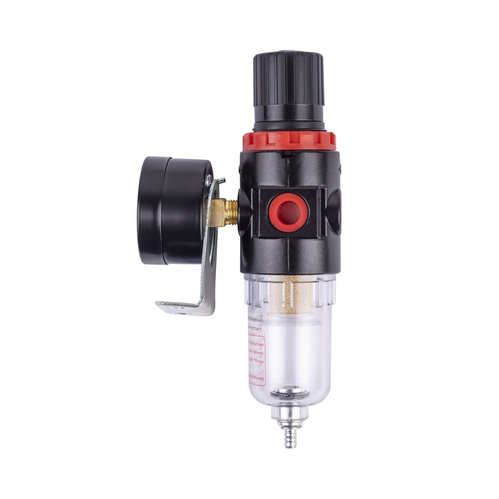 Устанавливается на выходе из ресивера компрессора. Регулятор давления необходим при работе с краскораспылителем, пневмоинструментом и другим оборудованием. Применение данного аксессуара увеличит срок службы оборудования, повысит эффективность и обеспечит его максимальную производительность. Оснащён осушителем центробежного типа. Чем быстрее поток воздуха внутри и заданное выходное давление, тем лучше влагоотделение. Помните о необходимости отвода конденсата из колбы влагоотделителя (осушителя). Регулятор давления с фильтром комплектуется манометром, с помощью которого можно выставить необходимое давление на выходе. Комплектуется встроенным кронштейном для крепления на стену.
