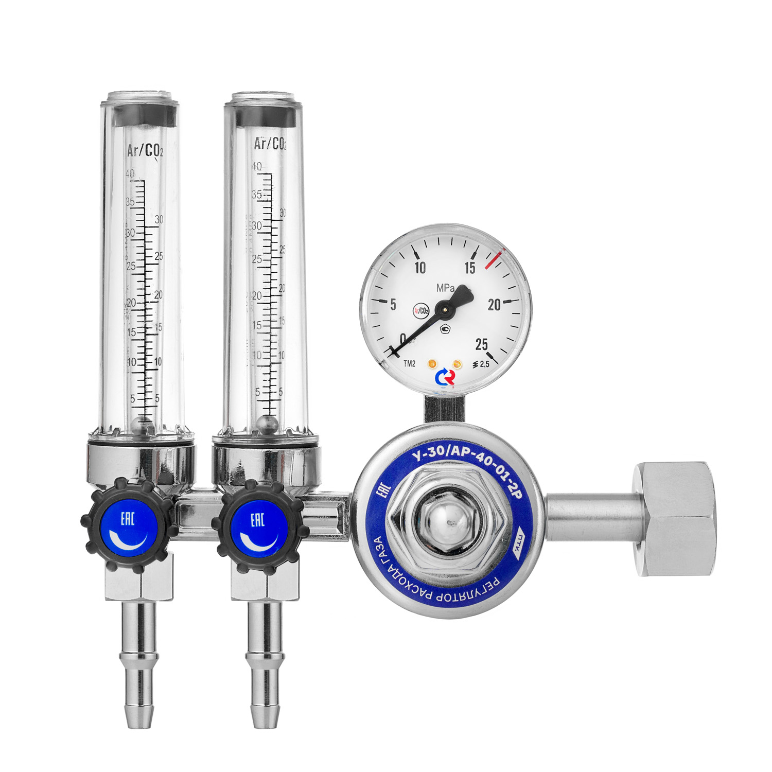 Корпус регулятора изготовлен из алюминия (литье под давлением). Корпус спаренных ротаметров изготовлен из силумина - сплав алюминия с кремнием. Колбы ротаметров изготовлены из прочного пластика, которые имеют две шкалы Ar/CO2.