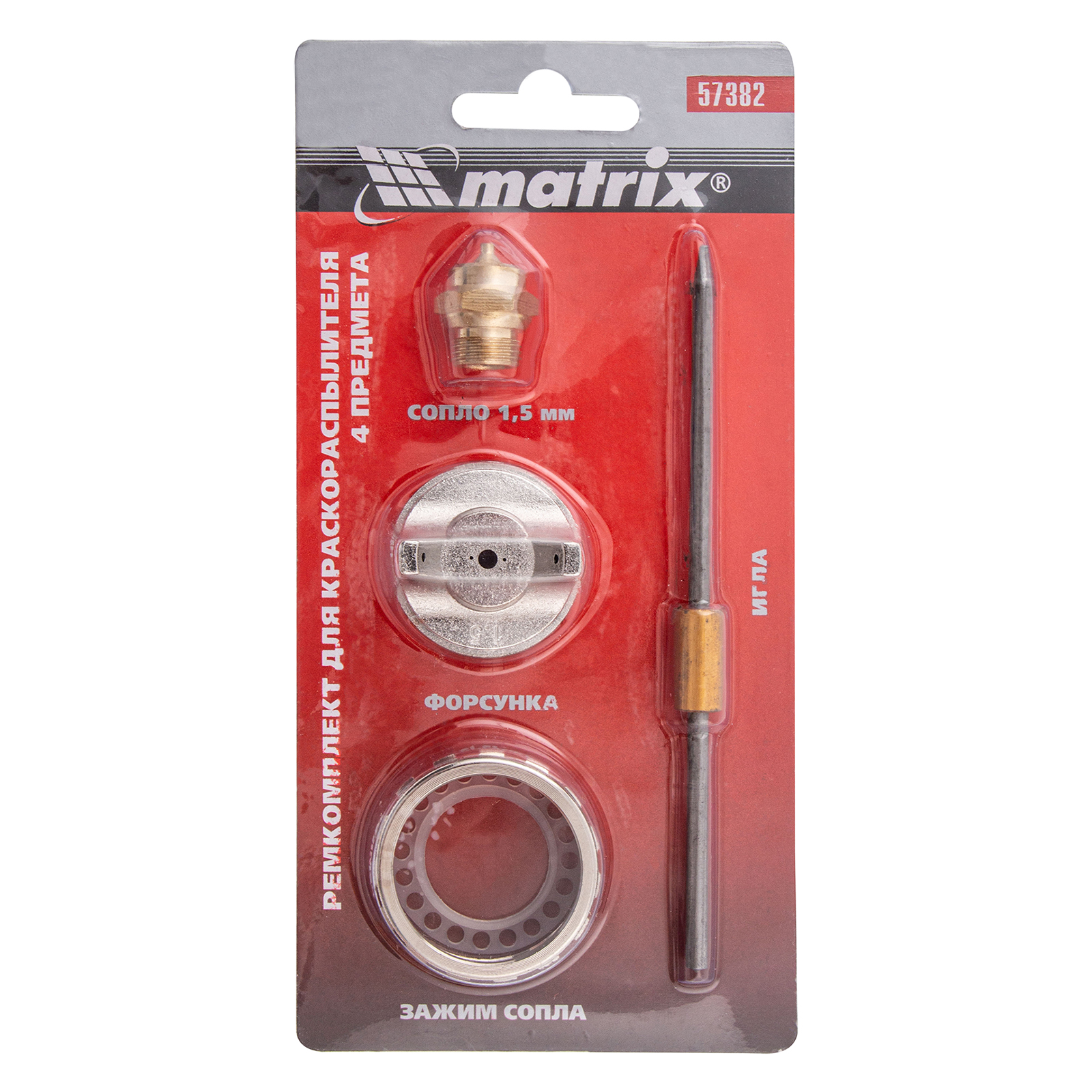 Ремкомплект Matrix 57382 предназначен для замены деталей на краскораспылителях Matrix 57314, 57315, 57316, 57317 и состоит из 4 предметов: сопла диаметром 1,5 мм, иглы, форсунки, зажима. Сопло, надежно фиксируемое зажимом, позволяет работать с густыми красками, грунтовками и шпаклевками.