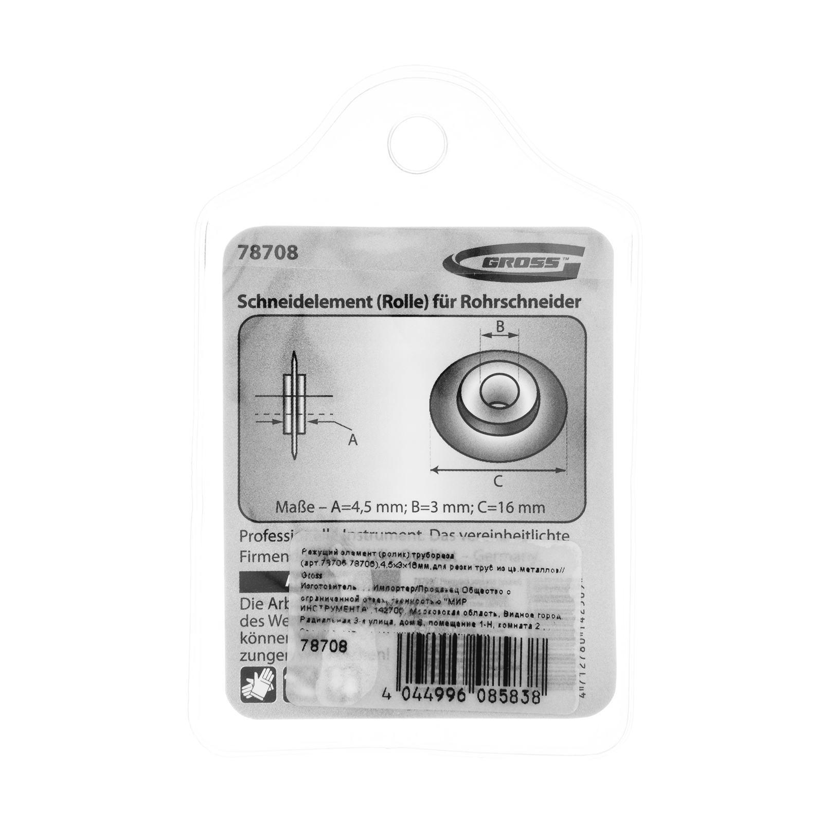 Режущий элемент, ролик трубореза для артиколов 78705, 78706, 4.5 х 3 х 16 мм, для резки труб из цветных металлов Gross в Санкт-Петербурге