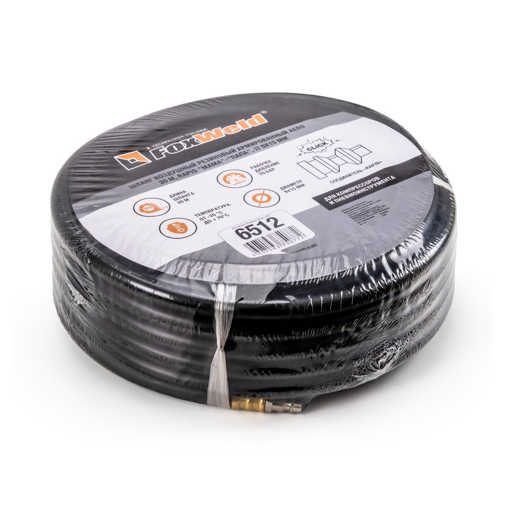 Воздушный резиновый армированный шланг AERO от FoxWeld с фитингами Rapid F - Rapid M, длиной 20 м. Используется для подключения пневмоинструмента к компрессору, достаточная длина оснастки позволяет осуществлять работы на требуемом расстоянии. Увеличенный внутренний диаметр шланга 9 мм обеспечивает лучшую пропускную способность для сжатого воздуха и обеспечивает сохранение максимальной производительности. Шланг класса С - произведен из маслостойкой резины (полиуретан), что обеспечивает ему высокую износоустойчивость и возможность подключения его к воздушной магистрали с содержанием частиц масла при работе в связке с масляным воздушным компрессором. Также благодаря армированию, шланг выдерживает высокие нагрузки по давлению сжатого воздуха до 25 бар и может храниться и эксплуатироваться при температурах от -25 до +70 градусов Цельсия. Концевые муфты типа рапид изготовлены из качественного сплава, устойчивого к коррозии и деформации. Изделие имеет соответствие стандарту ГОСТ ISO 2398-2014.