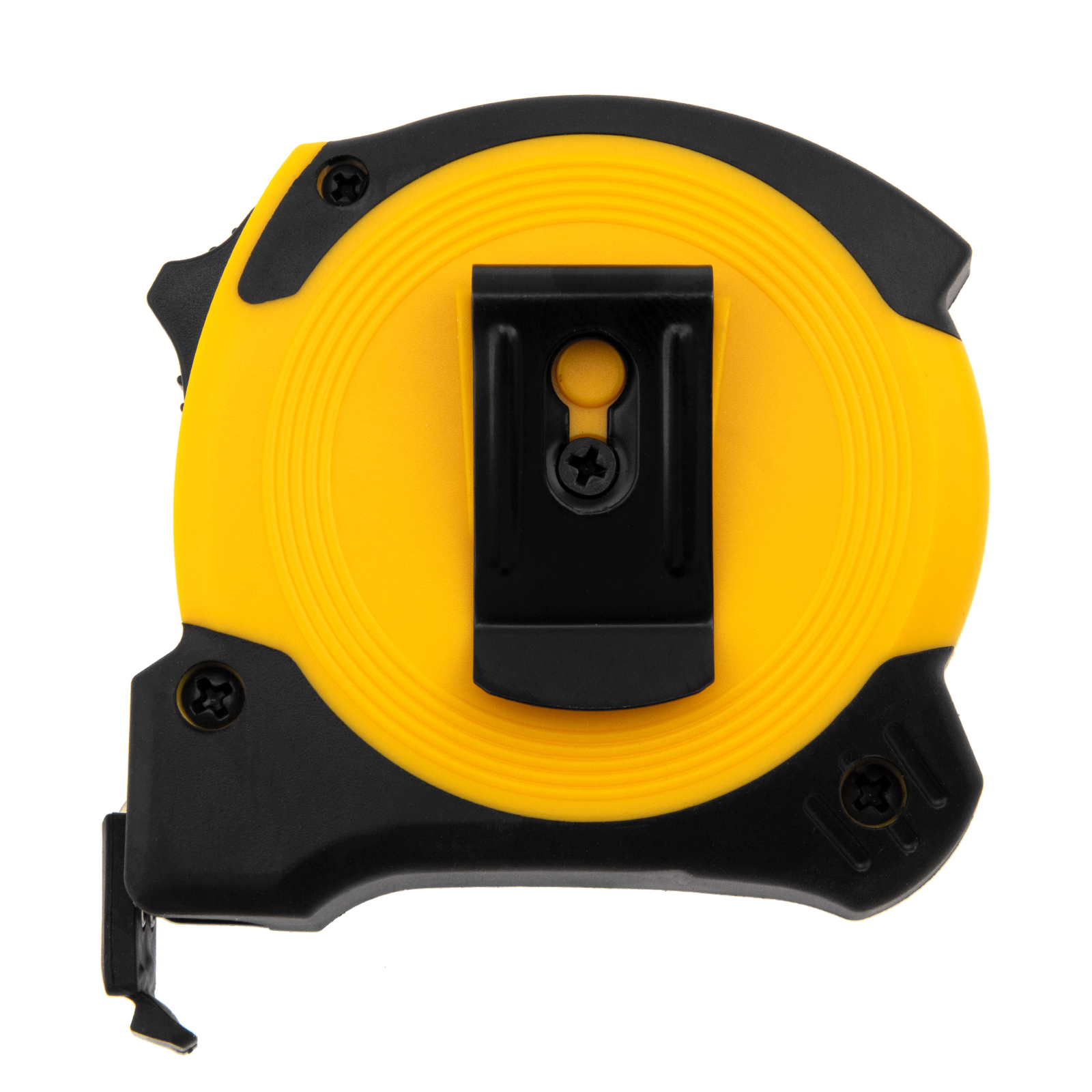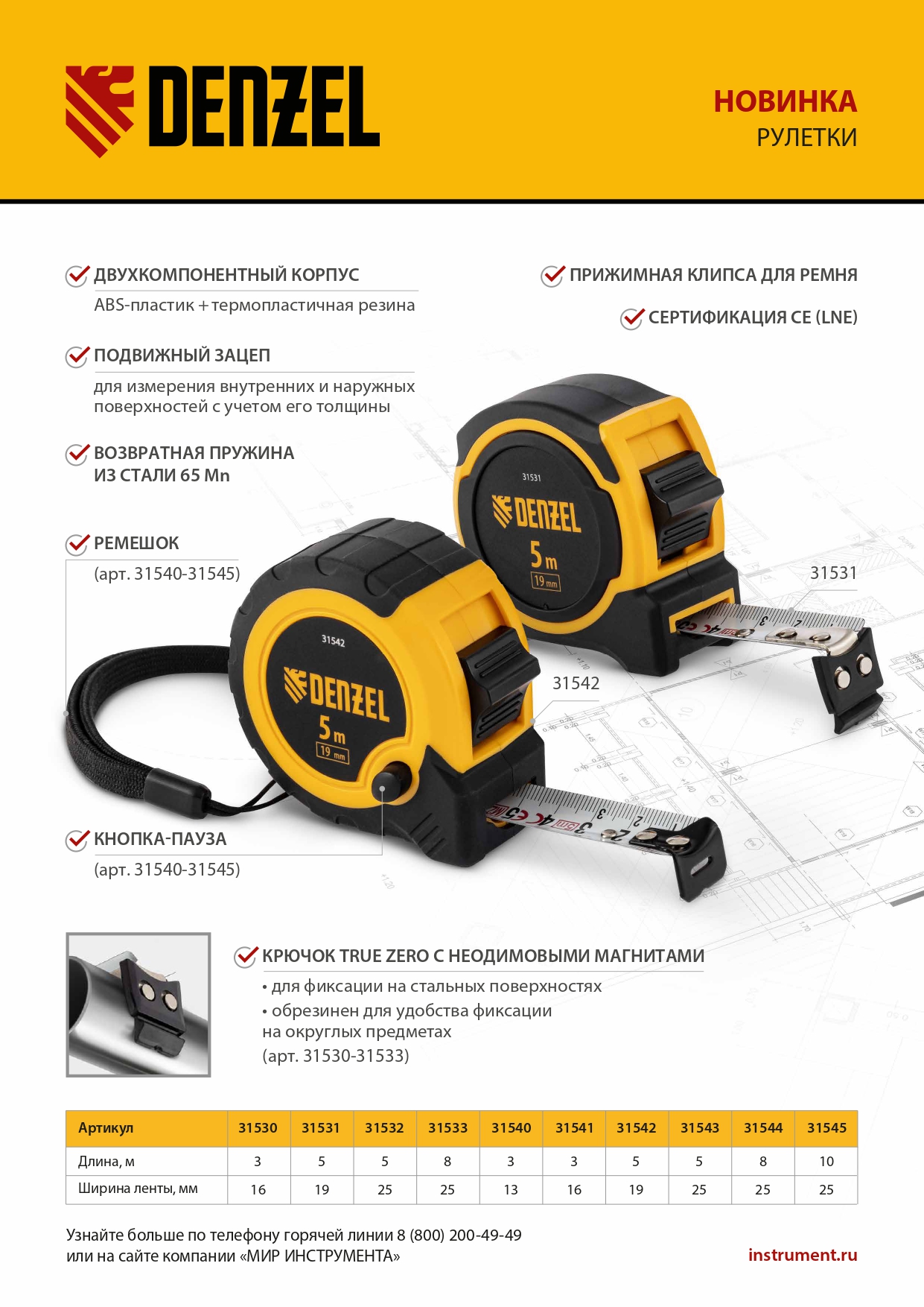 - Удобная фиксация на ремне — рулетка дополнена поясным зажимом.