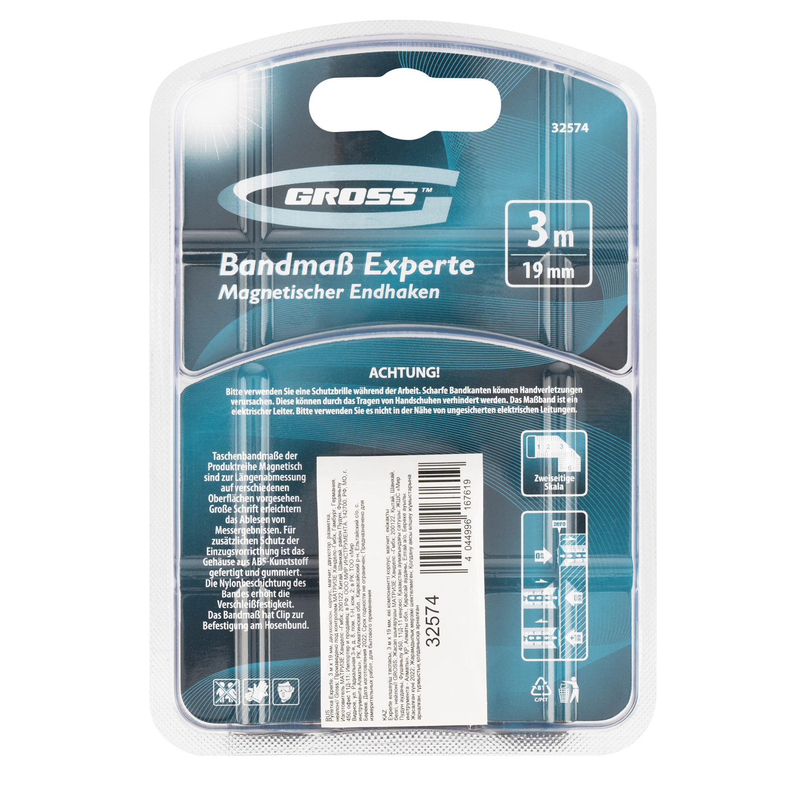 Рулетка Experte,3 м x 19 мм,двухкомпонентный корпус,магнит,двухсторонняя разметка,нейлон Gross