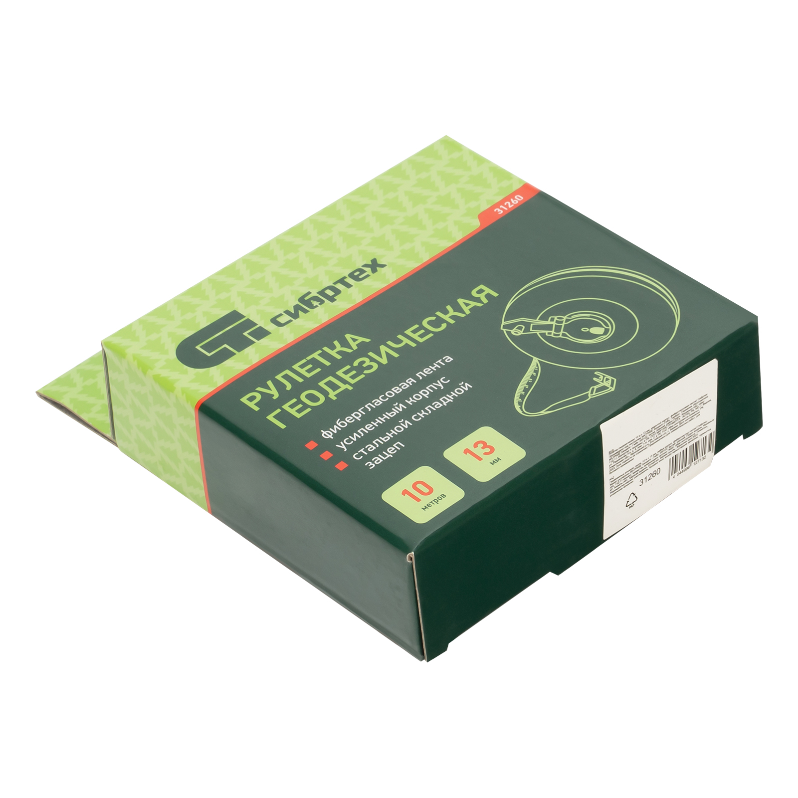 Геодезическая рулетка Сибртех 31260 с измерительным полотном длиной 10 м и шириной 13 мм, в закрытом корпусе, с фибергласовой лентой, — измерительный инструмент для определения расстояний и проведения замеров различных объектов. Рулетка пригодится во время выполнения строительных и ремонтных работ, обмеров садовых участков, а также при формировании ландшафтов.