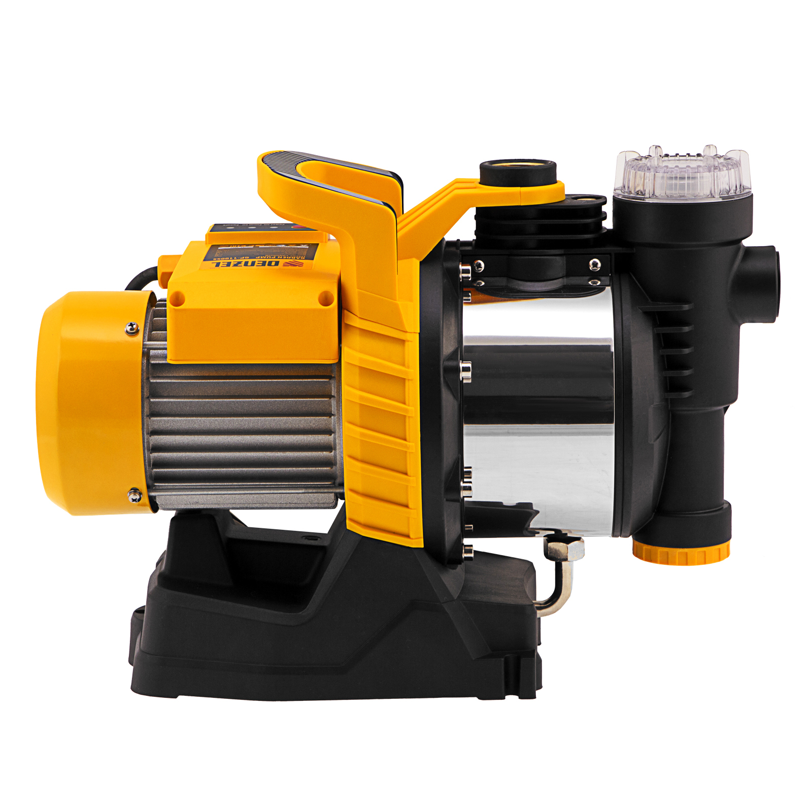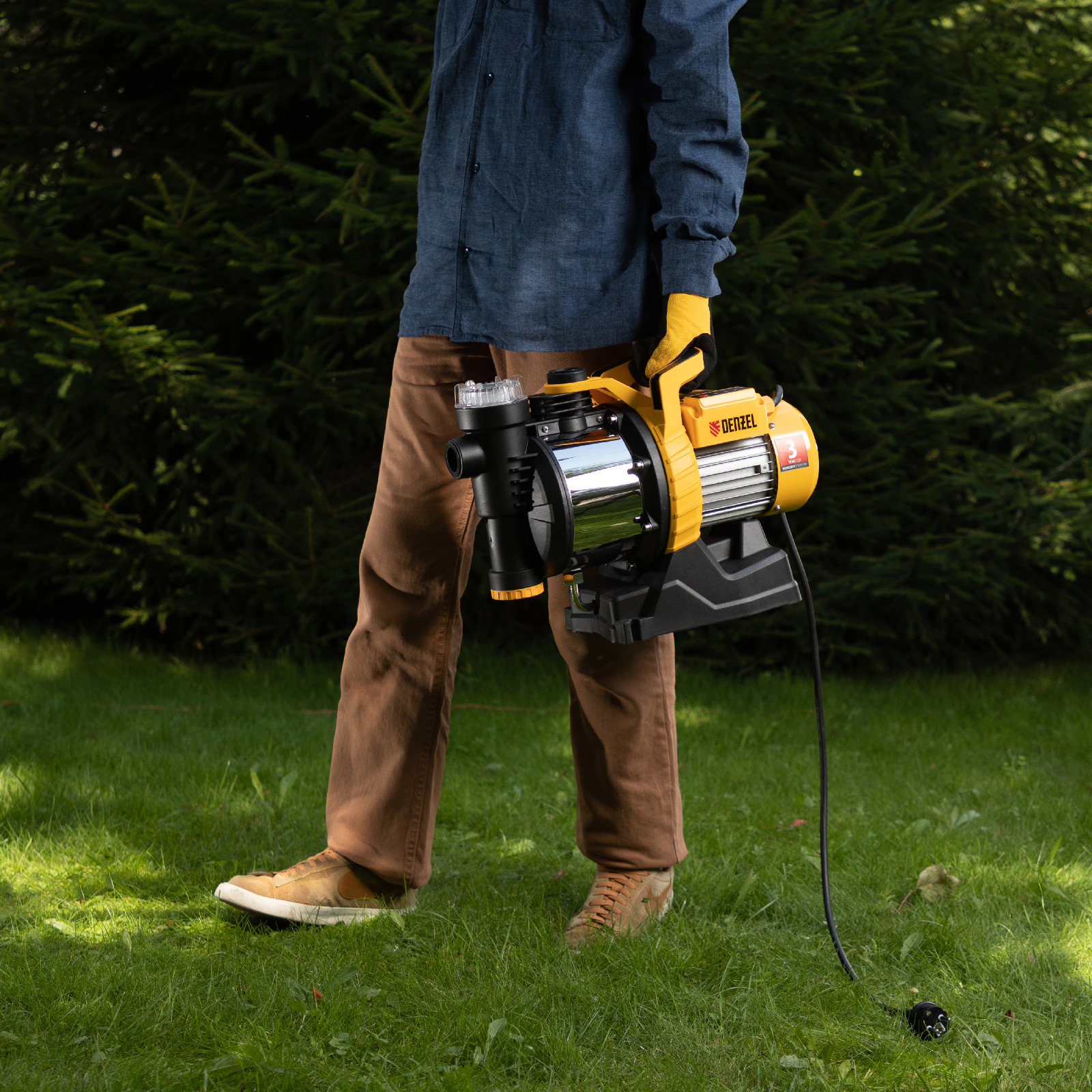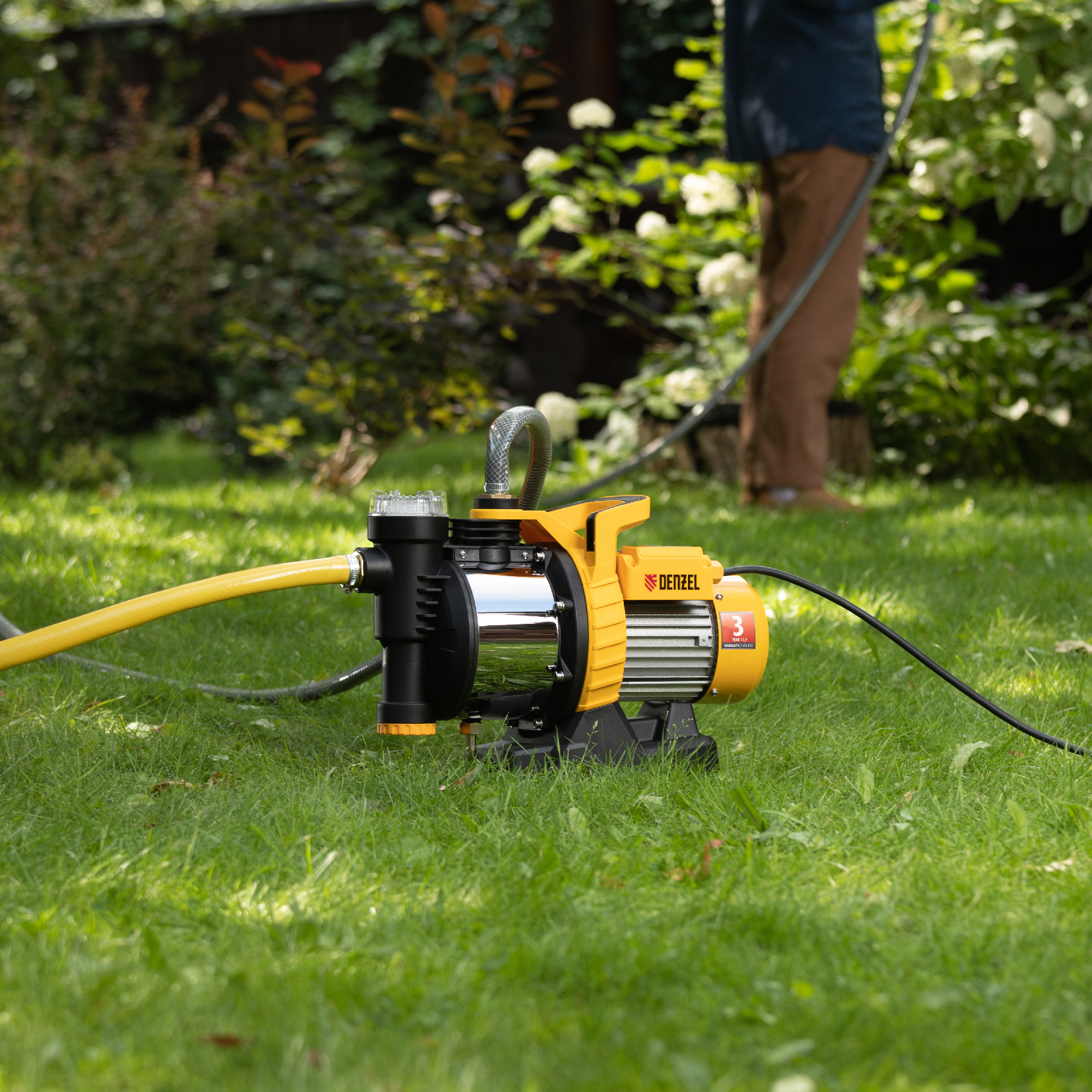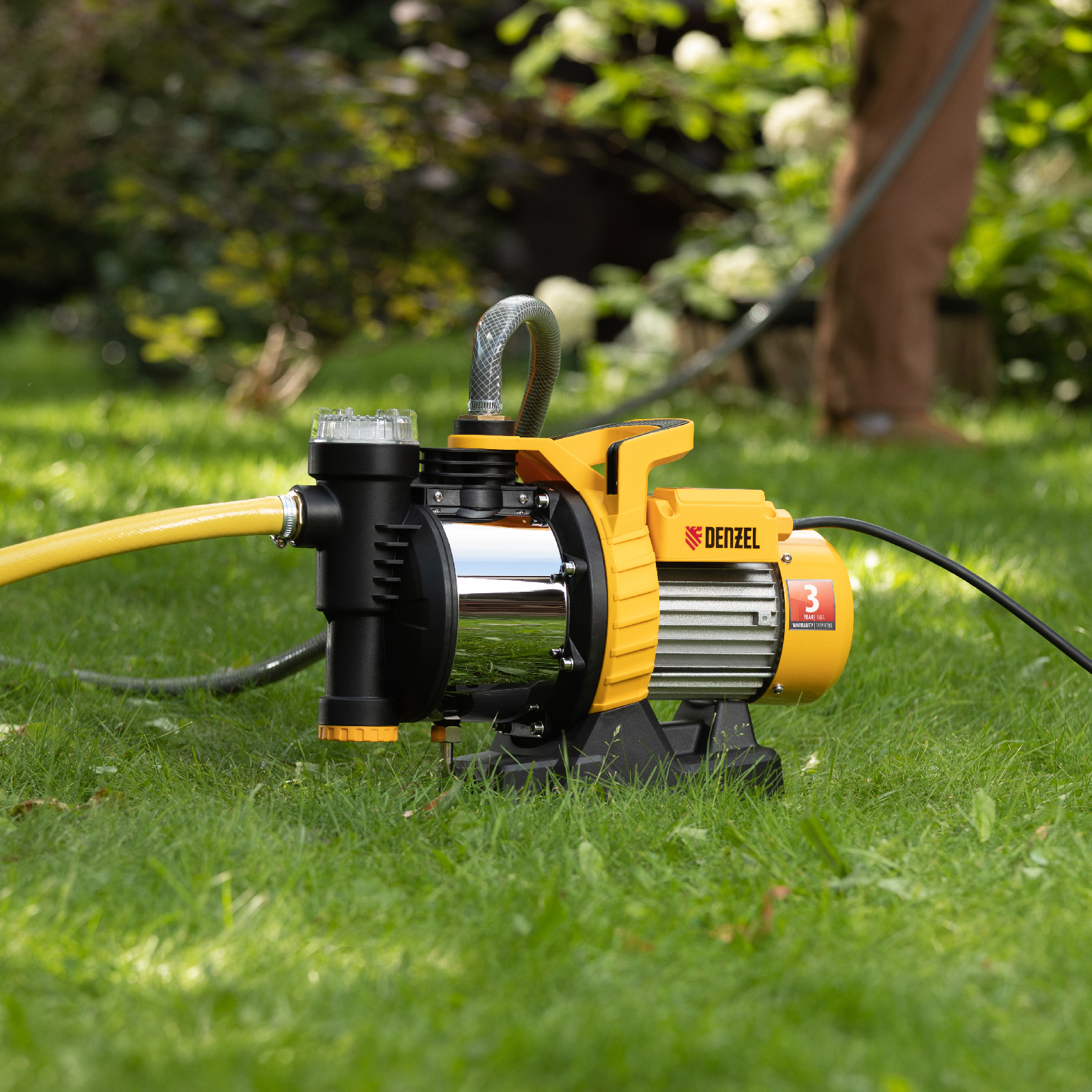 Садовый поверхностный насос Denzel GP1100SS 97305 мощностью 1100 Вт и производительностью до 4000 л/ч, с корпусом из пластика, осуществляет забор чистой воды с глубины до 8 м из колодцев, емкостей и водоемов, поднимая ее на высоту до 45 м. Используется для организации системы полива и водоснабжения на даче. Его можно подключать к водопроводной системе для обеспечения стабильного напора. Производительности насоса хватит для снабжения нескольких водоразборных точек одновременно.