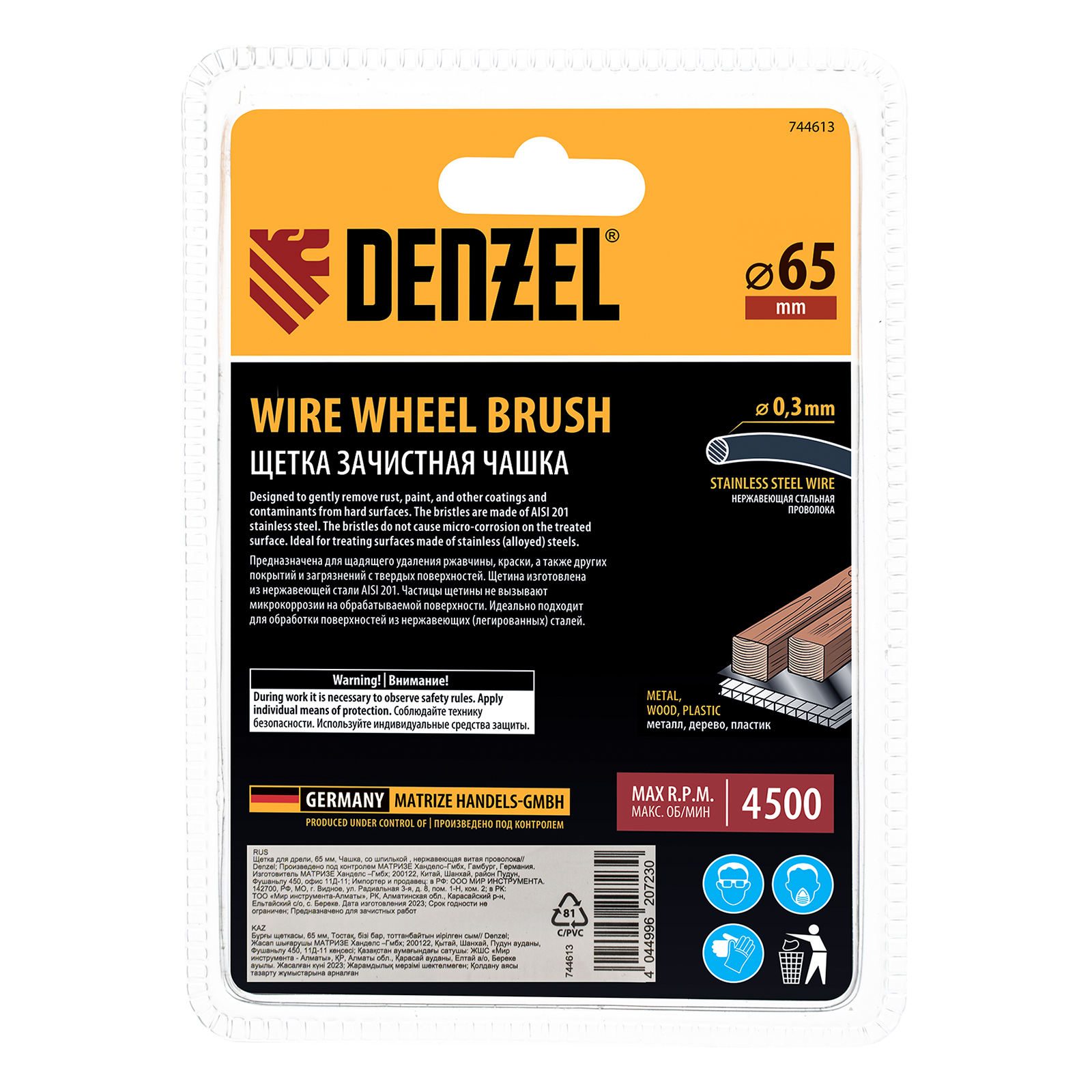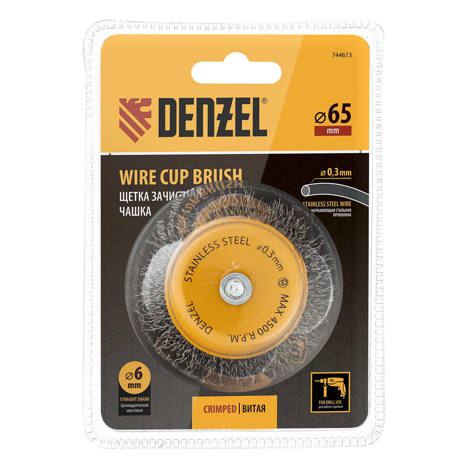 Щетка для дрели, 65 мм, Чашка, со шпилькой , нержавеющая витая проволока Denzel в Санкт-Петербурге