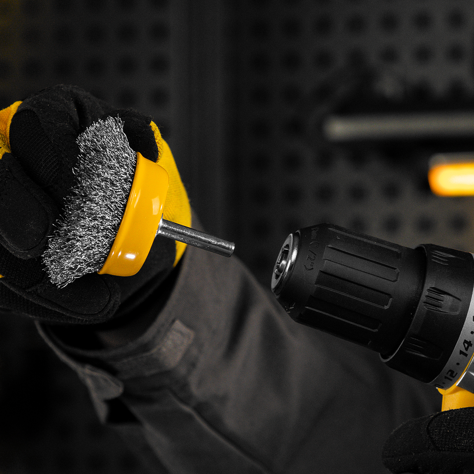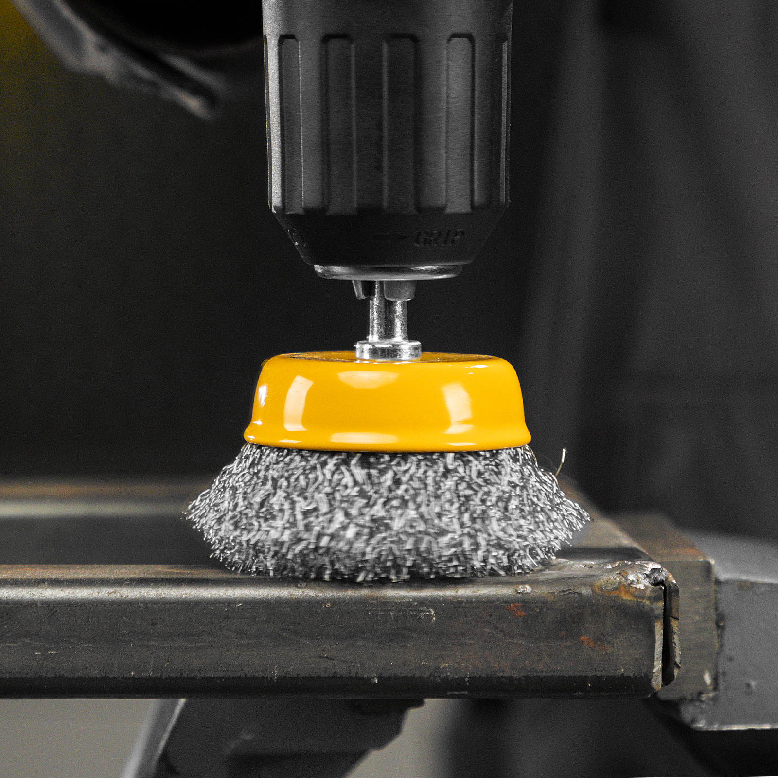 Щетка для дрели «Чашка» Denzel 744613 диаметром 65 мм, со шпилькой и щетиной из нержавеющей витой проволоки, используется для щадящей обработки плоских твердых поверхностей из металла, древесины, пластика, идеально подходит для нержавеющей стали. Оптимальна для снятия тонкого слоя старой краски, ржавчины, удаления загрязнений. Имеет хвостовик диаметром 6 мм и устанавливается в патрон дрели или прямошлифовальной машины (ПШМ).