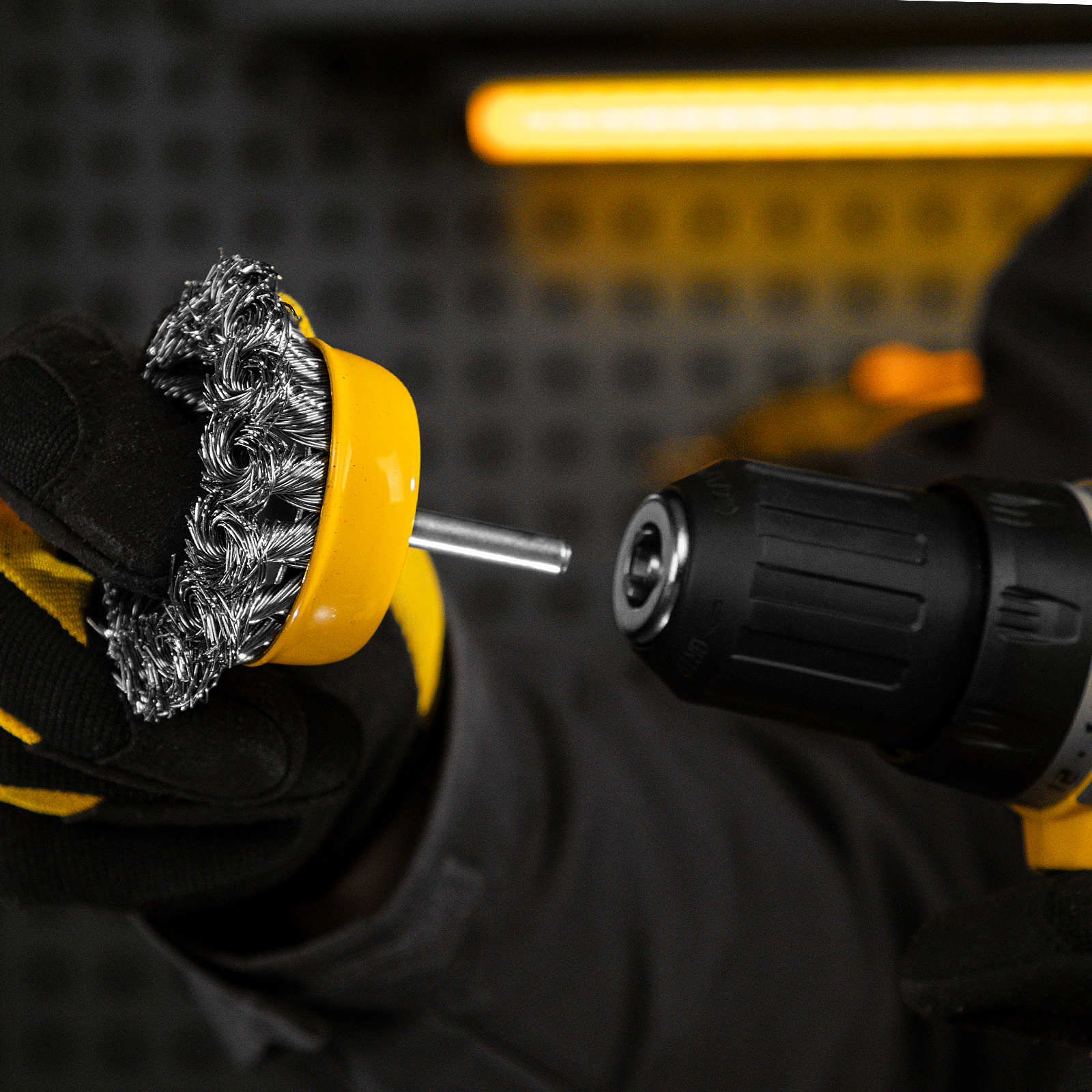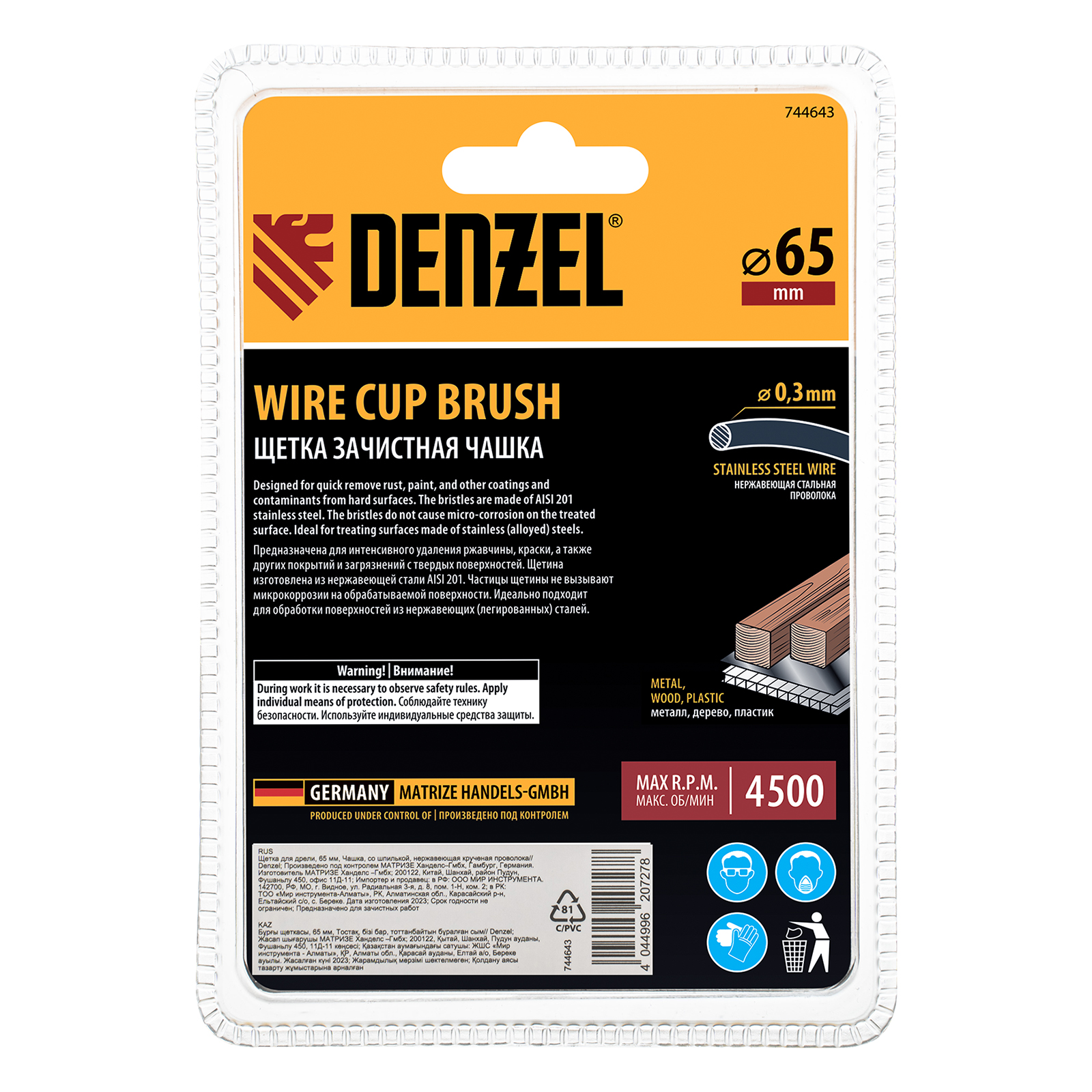 Щетка для дрели «Чашка» Denzel 744643 диаметром 65 мм, со шпилькой и щетиной из нержавеющей крученой проволоки, используется для грубой обработки плоских твердых поверхностей из металла, древесины, пластика, идеально подходит для нержавеющей стали. Оптимальна для снятия толстого слоя старой краски, ржавчины, удаления загрязнений. Имеет хвостовик диаметром 6 мм и устанавливается в патрон дрели или прямошлифовальной машины (ПШМ).