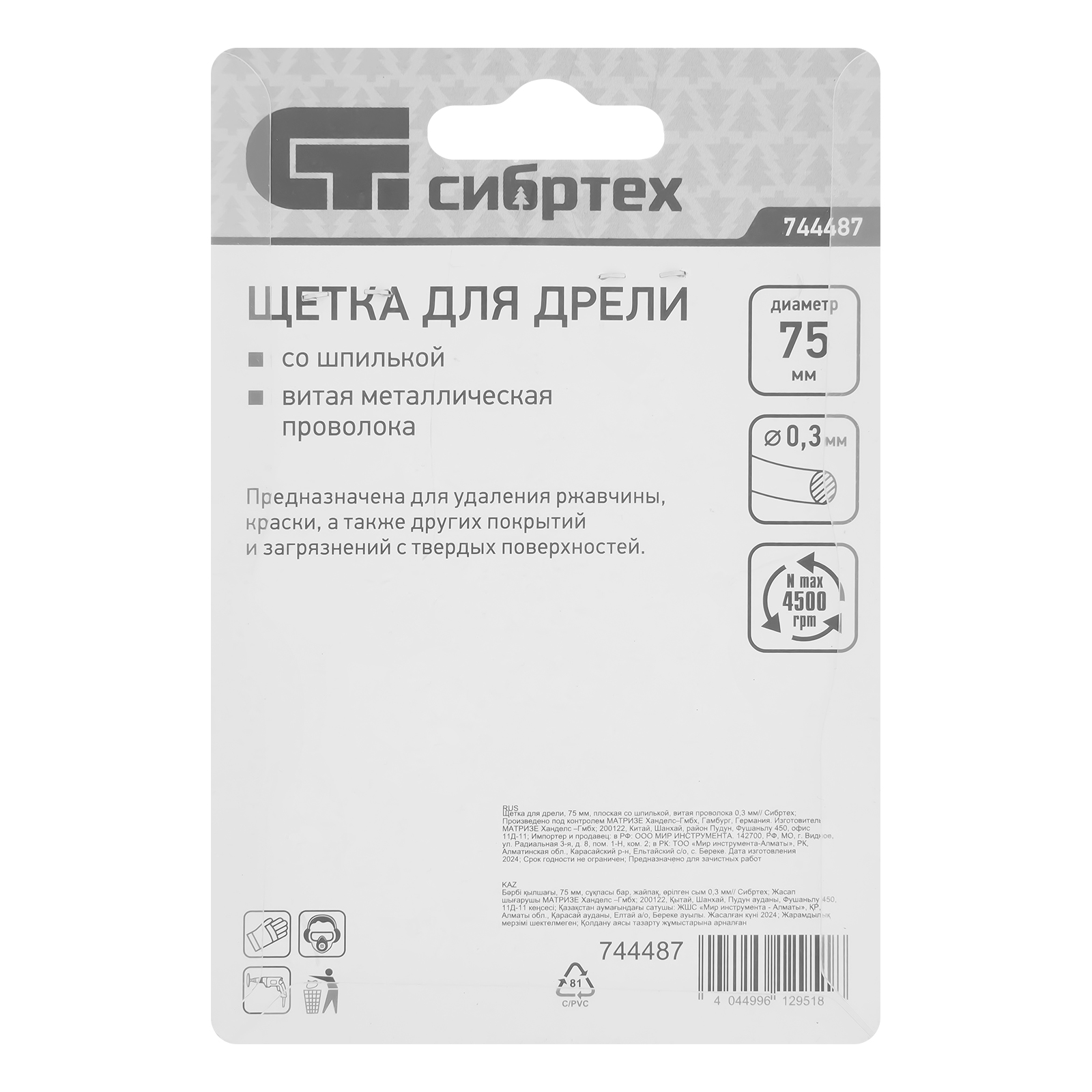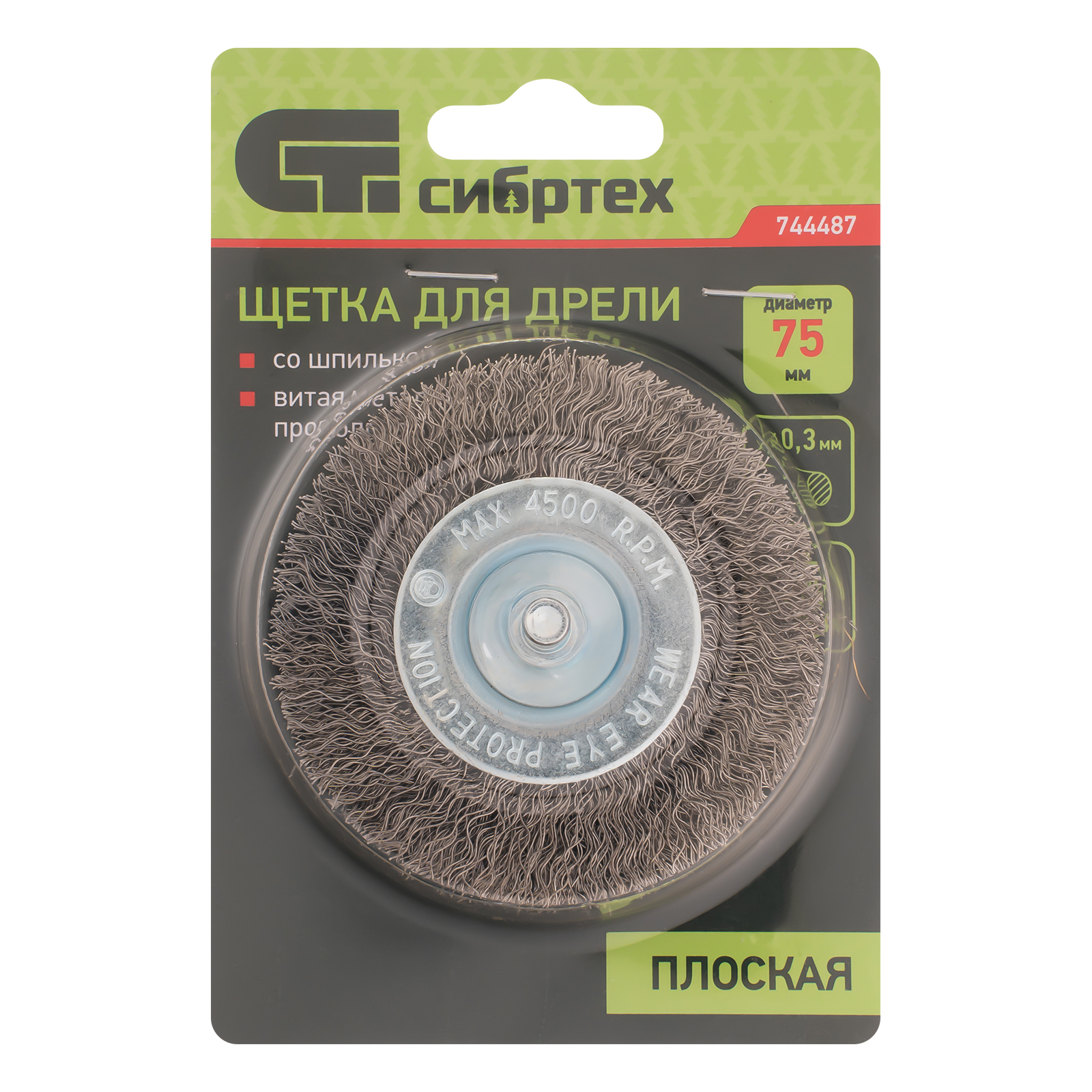 Плоская щетка для дрели Сибртех 744487 диаметром 75 мм, со шпилькой и щетиной из витой проволоки 0,3 мм, используется для щадящей обработки металлических, деревянных и пластиковых поверхностей. Удаляет загрязнения, ржавчину, старые лакокрасочные покрытия. Благодаря плоской форме щетка идеально подходит для очистки труднодоступных мест, пазов, изгибов, внутренних углов. Хвостовик диаметром 6 мм устанавливается в патрон дрели. Рекомендуемая скорость вращения 4500 об/мин. Во время работы следует использовать средства индивидуальной защиты. Щетку применяют во время строительства, ремонта, а также в быту.