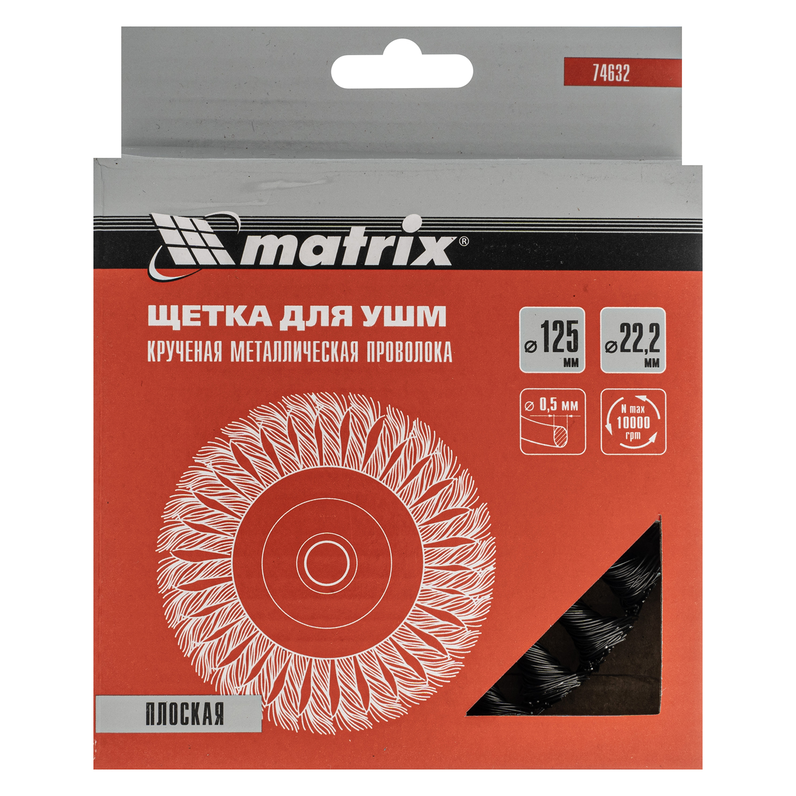 Плоская щетка Matrix 74632 диаметром 125 мм и посадкой 22,2 мм, с щетиной из крученой проволоки толщиной 0,5 мм, устанавливается на вал УШМ, поддерживающей скорость вращения не более 10000 об/мин. Эффективно удаляет загрязнения, толстый слой ржавчины и лакокрасочных материалов с поверхностей, поэтому используется для проведения грубой (черновой) обработки. Плоской щеткой удобно очищать труднодоступные места, в том числе углы и изгибы.