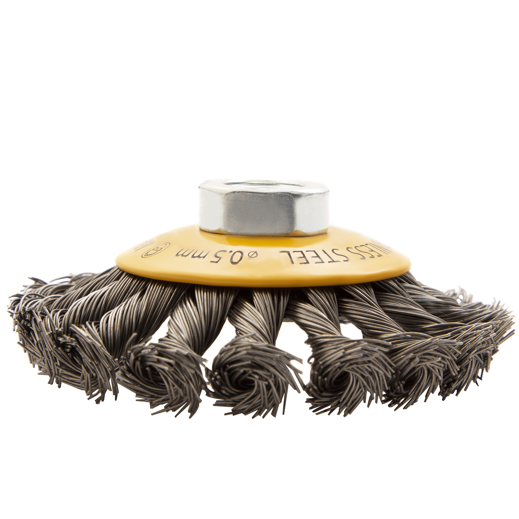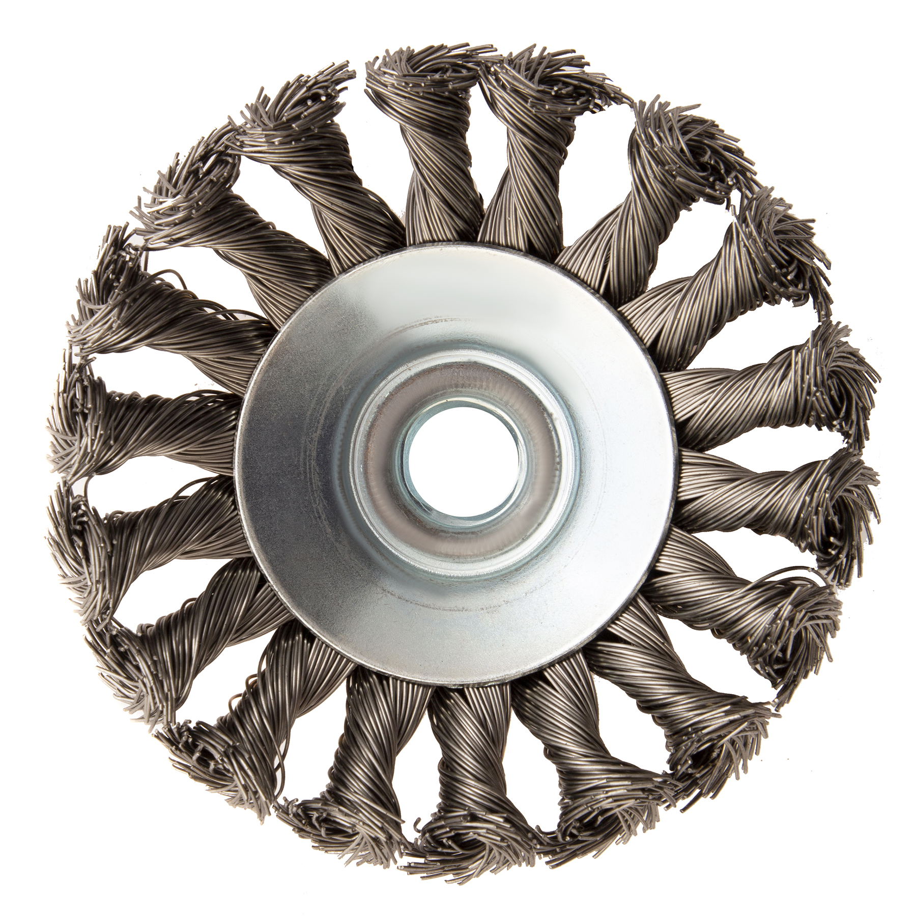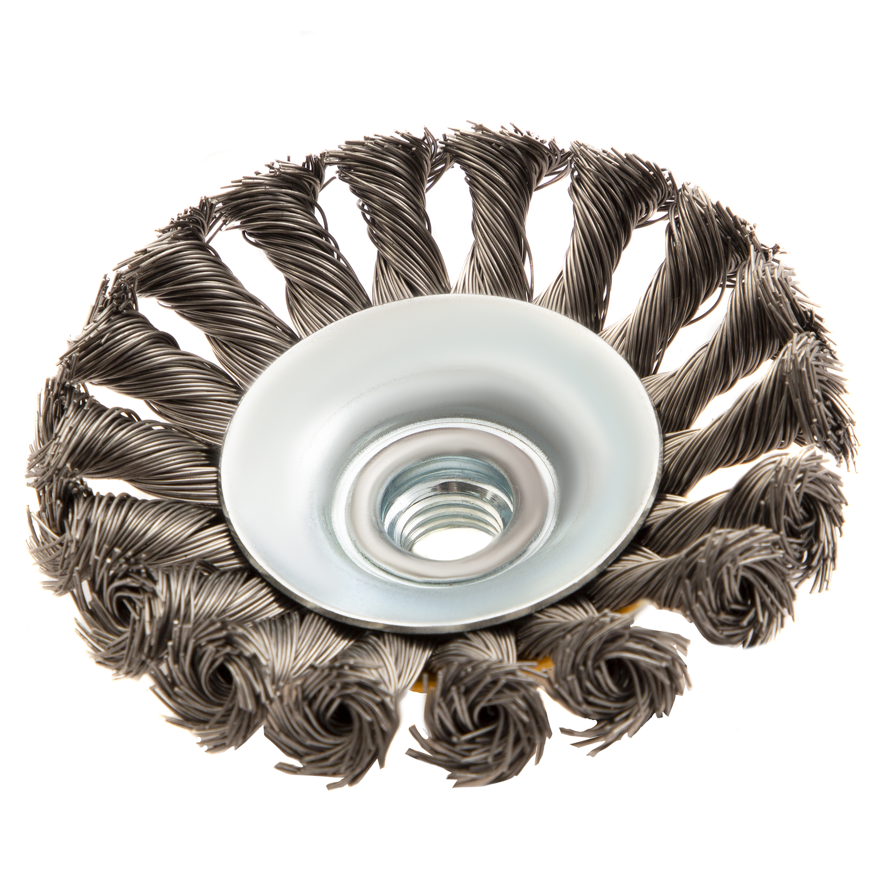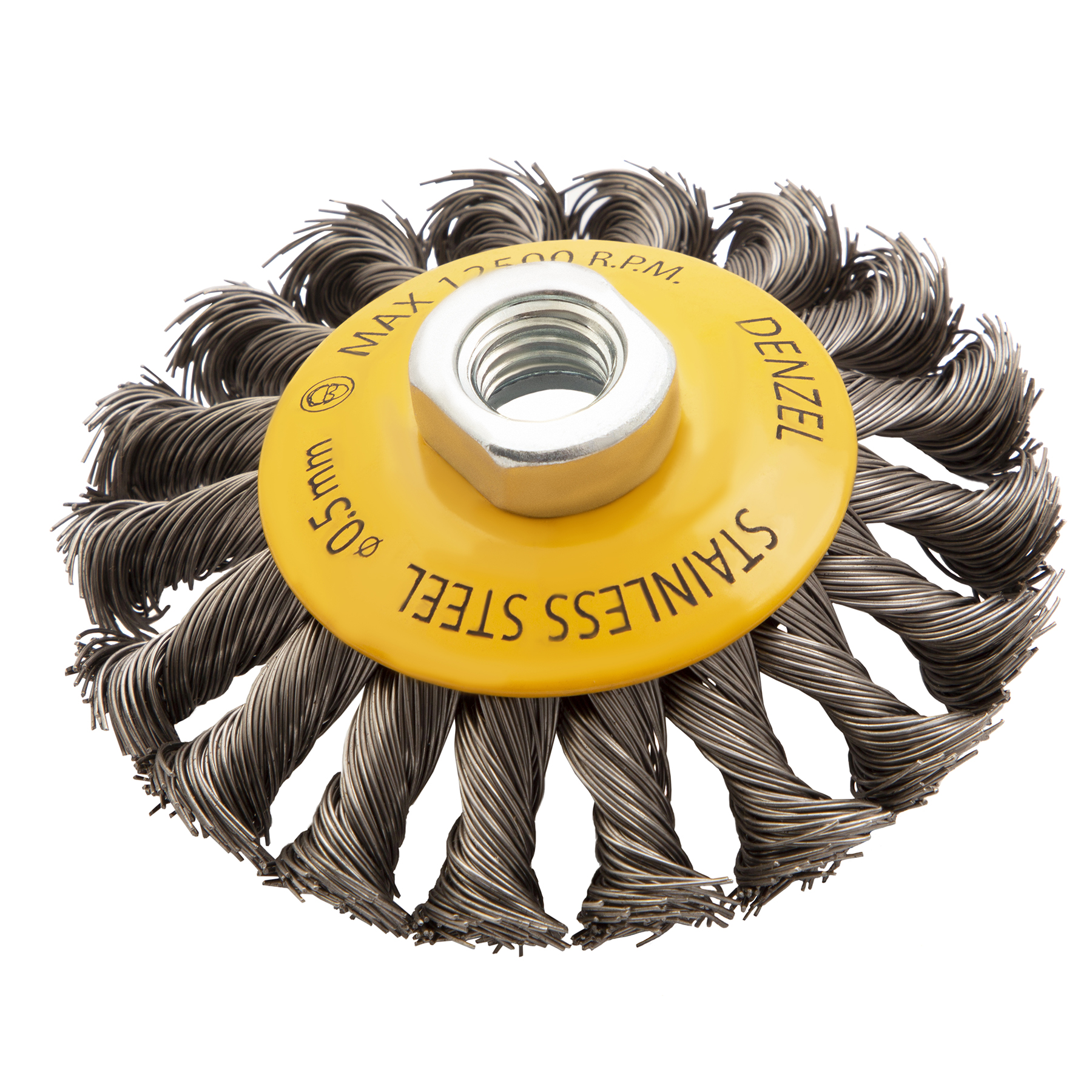 Щетка для УШМ, 100 мм, "Тарелка", крученая нержавеющая проволока 0.5 мм, М14 Denzel