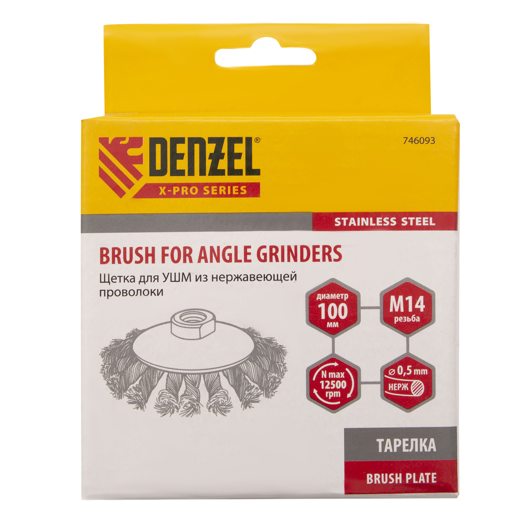 Щетка для УШМ Denzel «Тарелка» 746093, 100 мм, М14, с щетиной из крученой нержавеющей проволоки 0,5 мм, предназначена для снятия толстого слоя краски, лака, ржавчины, для удаления заусенцев и окалины, зачистки сварных швов. Щеткой обрабатывают твердые, преимущественно металлические поверхности, в том числе из нержавеющей стали. Она удобна для очистки как плоских изделий, так и внутренних углов, пазов, изгибов. Щетка совместима с углошлифовальными машинами, поддерживающими работу на скорости до 12500 об/мин. Во время работы необходимо использовать средства индивидуальной защиты. Щетка пригодится во время строительства, на производстве, а также будет полезна в быту.