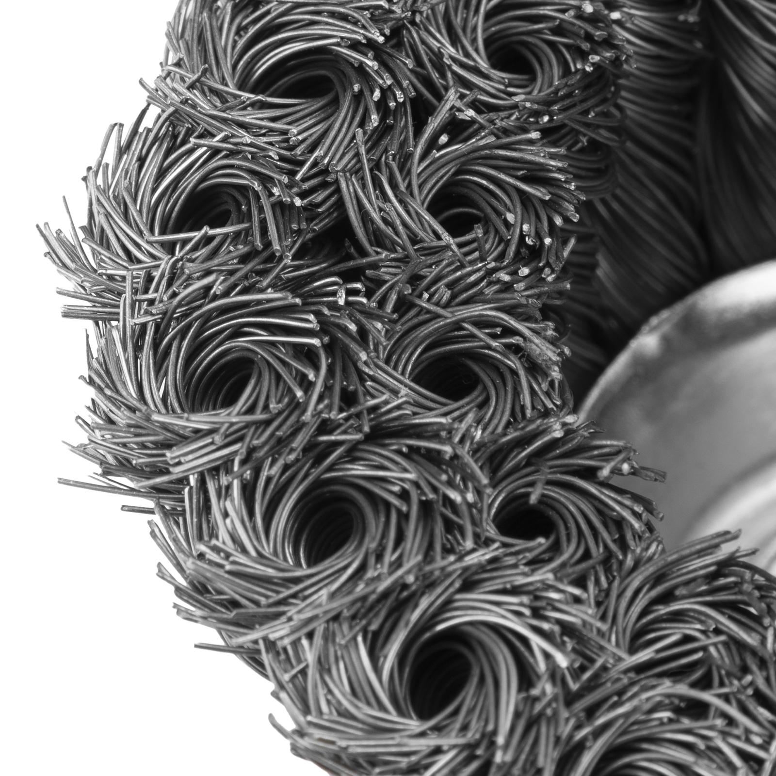 Двухрядная щетка Matrix «Чашка» 74677 диаметром 100 мм, с щетиной из крученой проволоки толщиной 0,35 мм, устанавливается на вал углошлифовальной машины с помощью гайки М14. Рекомендованная максимальная скорость вращения — до 8500 об/мин. Оснастка оптимальна для грубой (черновой) обработки: снятия старого слоя лакокрасочного покрытия и ржавчины, удаления загрязнений, зачистки сварных швов. Эффективно справляется с зачисткой больших поверхностей, подходит для выполнения работ повышенной сложности.