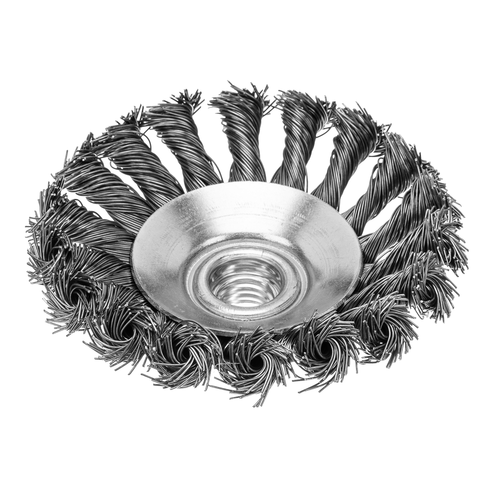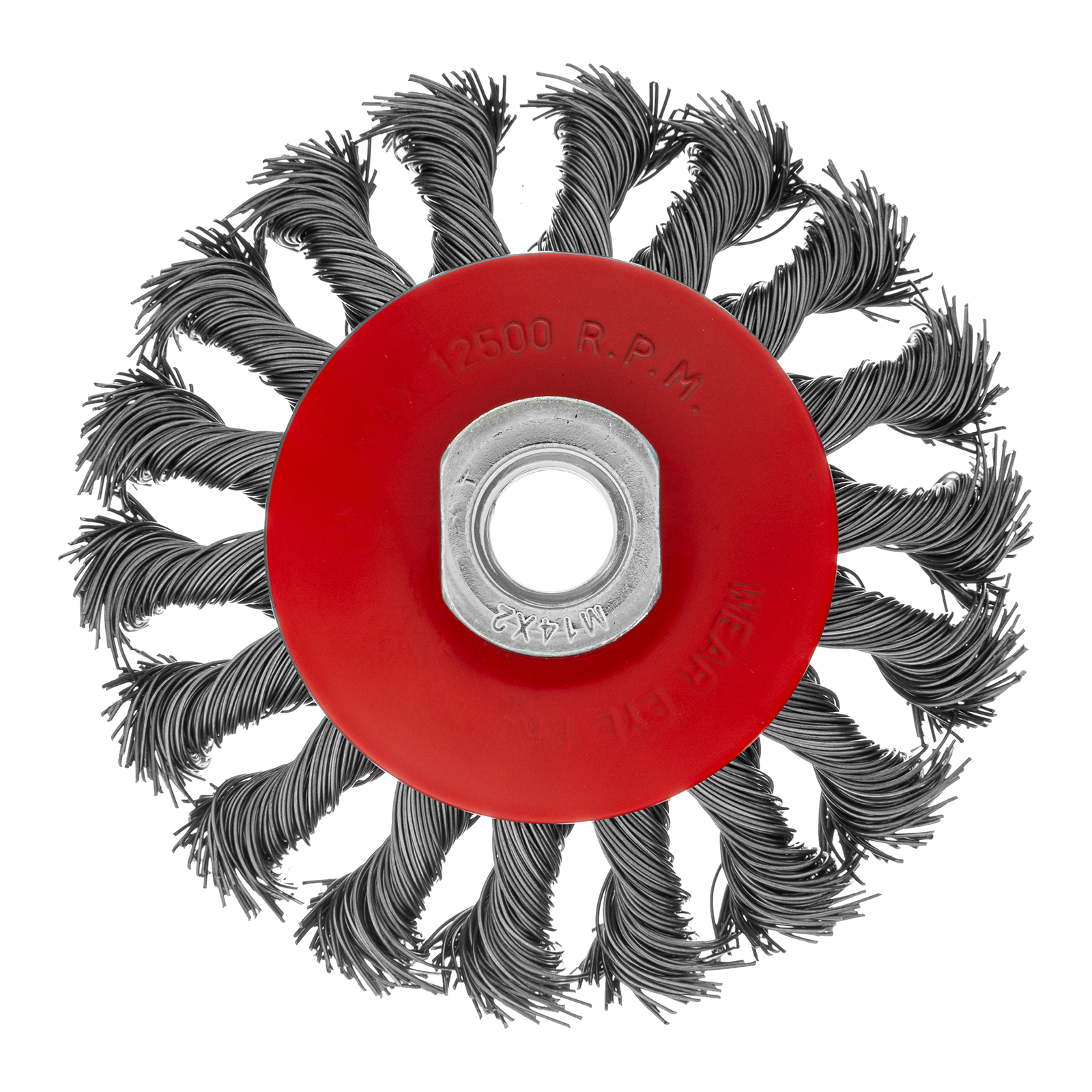 Щетка Matrix «тарелка» 74609 диаметром 100 мм, с щетиной из крученой проволоки толщиной 0,5 мм, устанавливается на УШМ при помощи гайки М14. Выполнена в форме тарелки, за счет чего подходит для грубой (черновой) обработки плоских и угловых поверхностей. Удаляет ржавчину, загрязнения, лакокрасочные покрытия, подходит для зачистки сварных швов. Использование на скорости до 12500 об/мин позволяет продлить срок службы насадки.