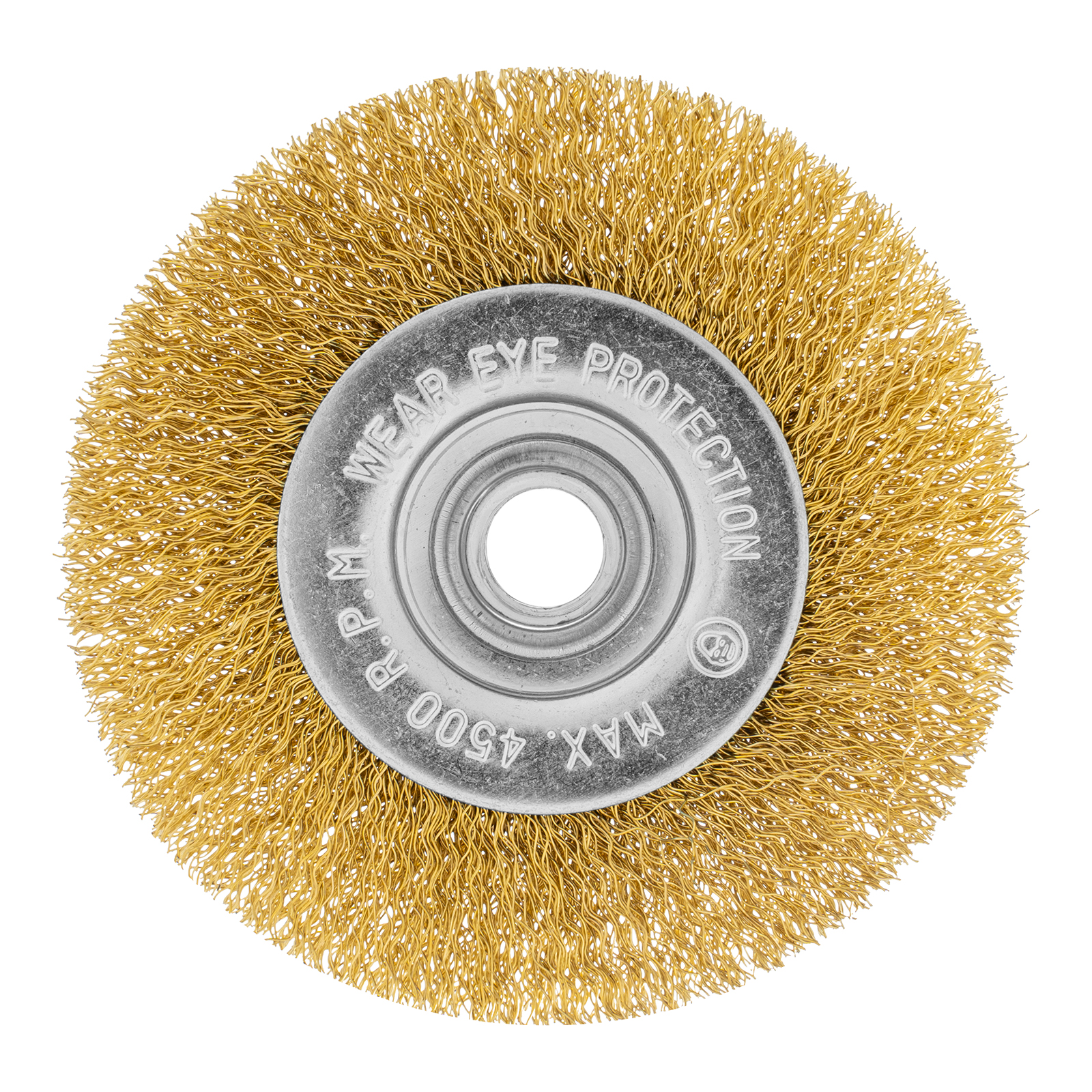 Плоская щетка Matrix 74650 диаметром 100 мм, с щетиной из латунированной витой проволоки, крепится к валу УШМ с помощью гайки М14. Используется для щадящей обработки поверхностей, снятия тонкого слоя ржавчины, лакокрасочных покрытий, удаления въевшихся загрязнений. Плоской щеткой удобно работать в труднодоступных местах: углах и изгибах. При эксплуатации на рекомендованной скорости 4500 об/мин оснастка прослужит долго.