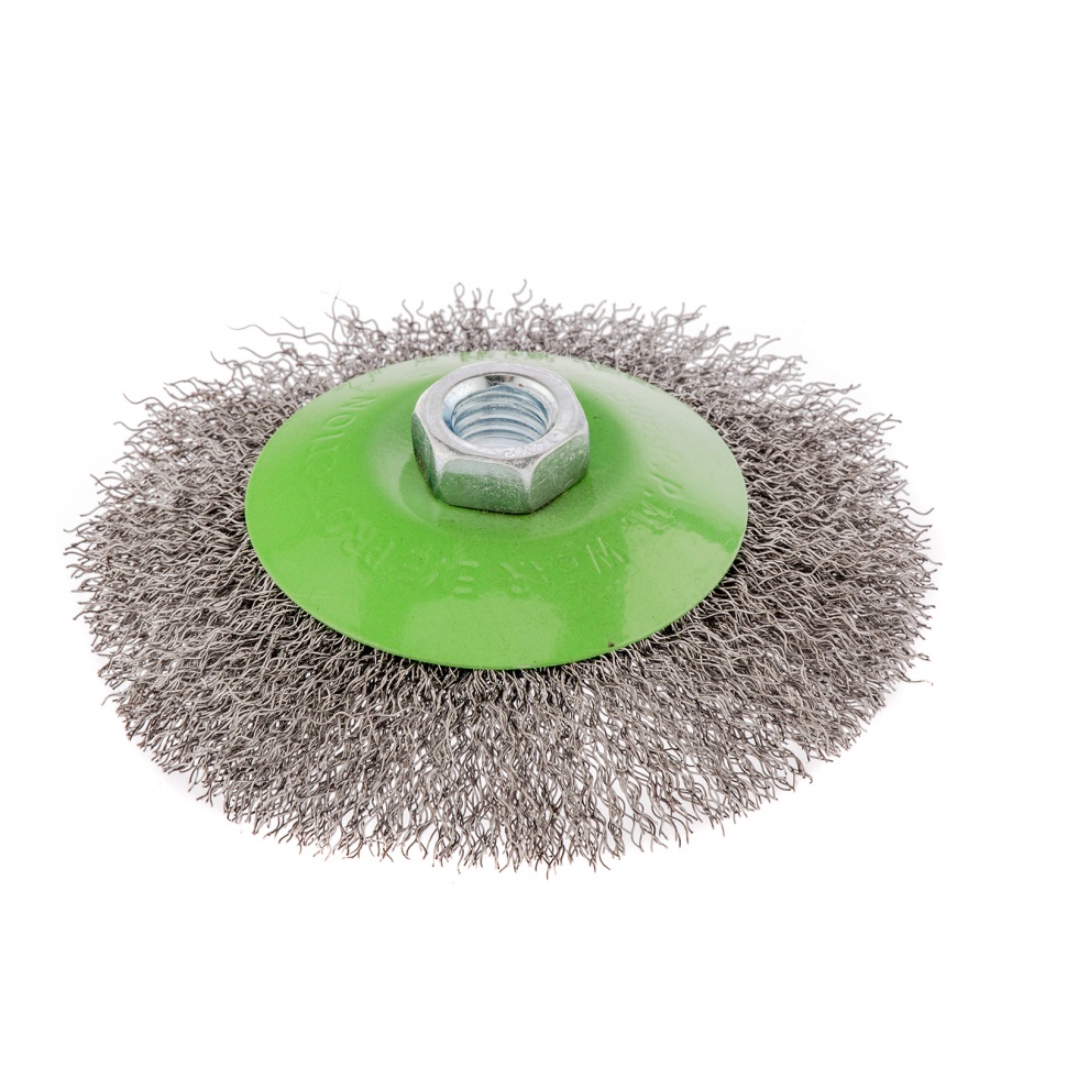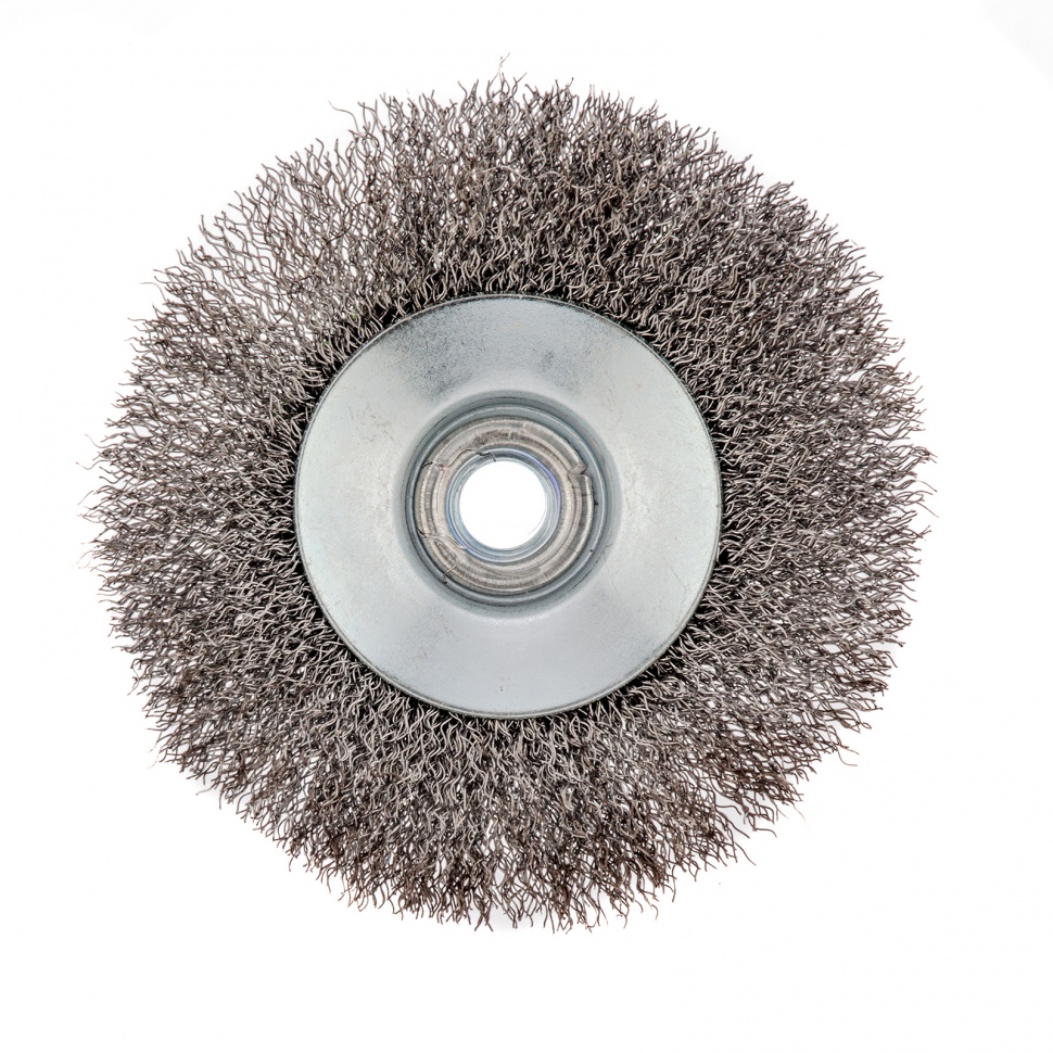 Щетка для УШМ «Тарелка» Сибртех 746127, М14, 115 мм, с щетиной из витой проволоки толщиной 0,3 мм, применяется для очистки металлических, деревянных и пластиковых поверхностей от ржавчины, старых лакокрасочных покрытий и загрязнений. Очищает как плоскости, так и труднодоступные места, поэтому оптимальна для обработки изделий сложной формы. Подходит для придания материалу шероховатости и матовости. Щетка устанавливается на вал углошлифовальной машины и выдерживает вращение со скоростью до 12500 об/мин, что обеспечивает высокую производительность оснастки. Во время работы следует использовать средства индивидуальной защиты. Щетка пригодится для проведения ремонта и решения бытовых задач.