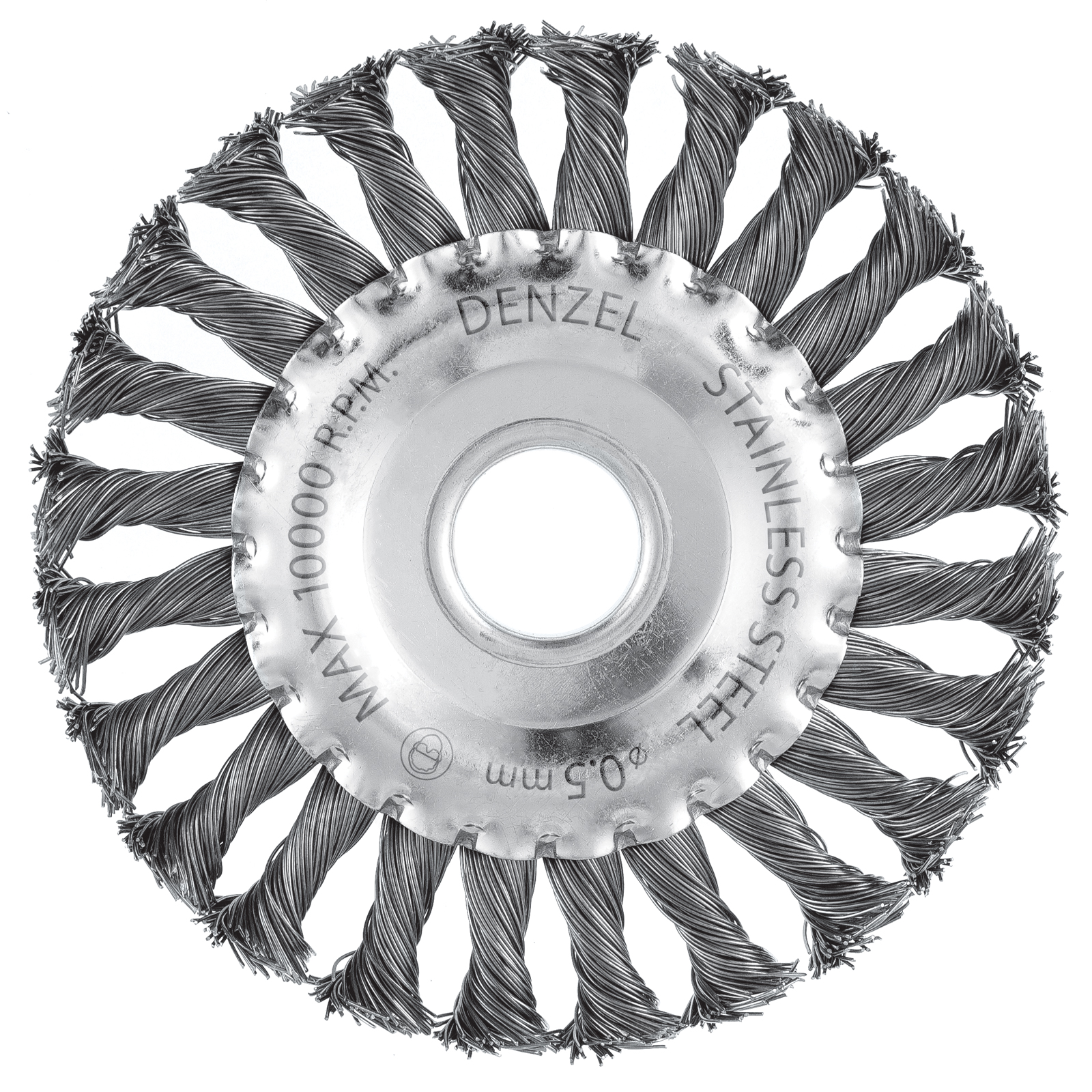 Щетка для УШМ, 125 мм, "Плоская", крученая нержавеющая проволока 0.5 мм, посадка 22.2 мм Denzel